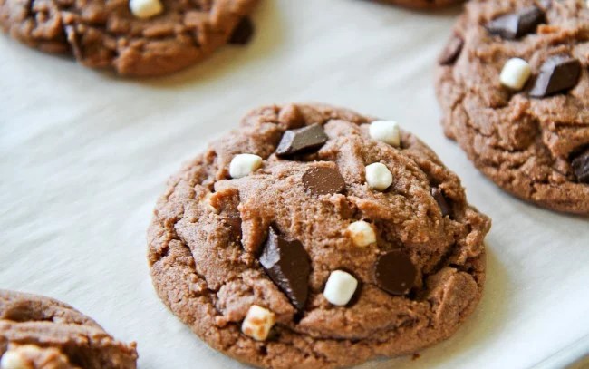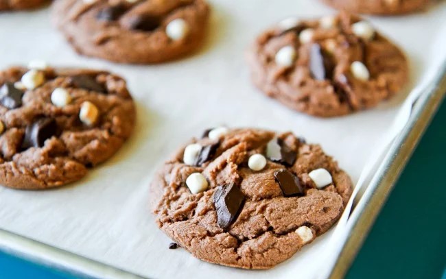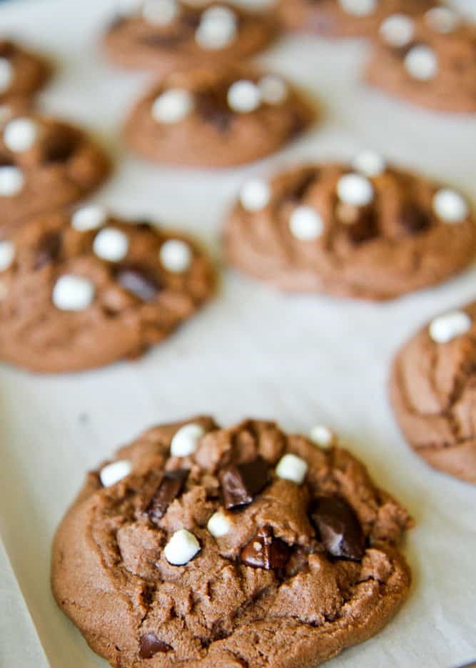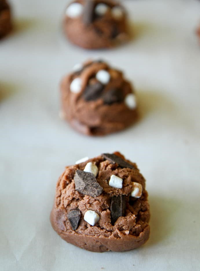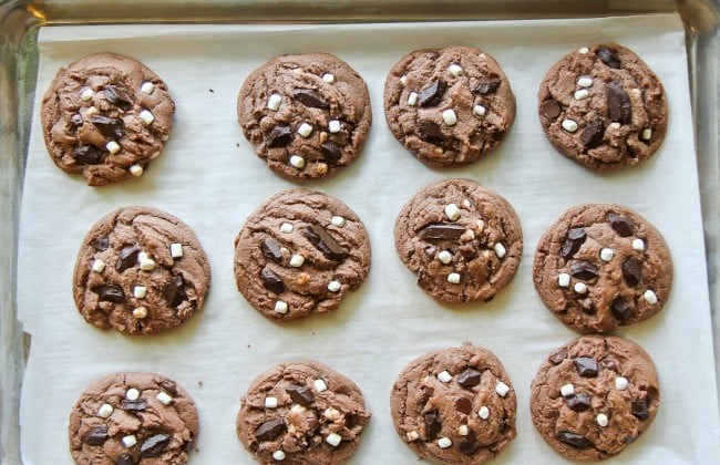 ***I’ve found that when chilling the dough for 30 minutes, sometimes it can cause the Mallow Bits to melt when baking. It’s not consistent, and I think it’s dependent on how fresh/dry the Mallow Bits are. One way to completely avoid this problem is to mix the Mallow Bits in AFTER you chill the dough. You can just press them into the dough, since it’s a stiff, thick dough. We like to press them into the tops of the dough once we’ve scooped it.