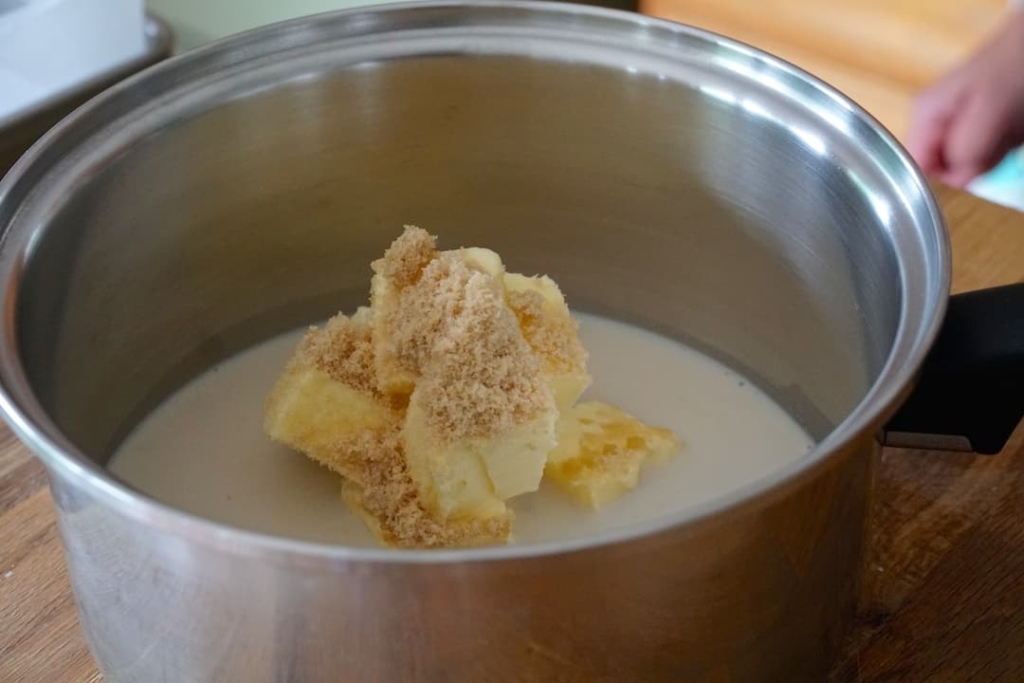 Melt the butter in a saucepan over medium-low heat and whisk in the brown sugar, milk and vanilla, heating for just a minute to take the chill off the milk. Remove the pan from the heat and whisk in the graham cracker crumbs – this will make a fluid paste.