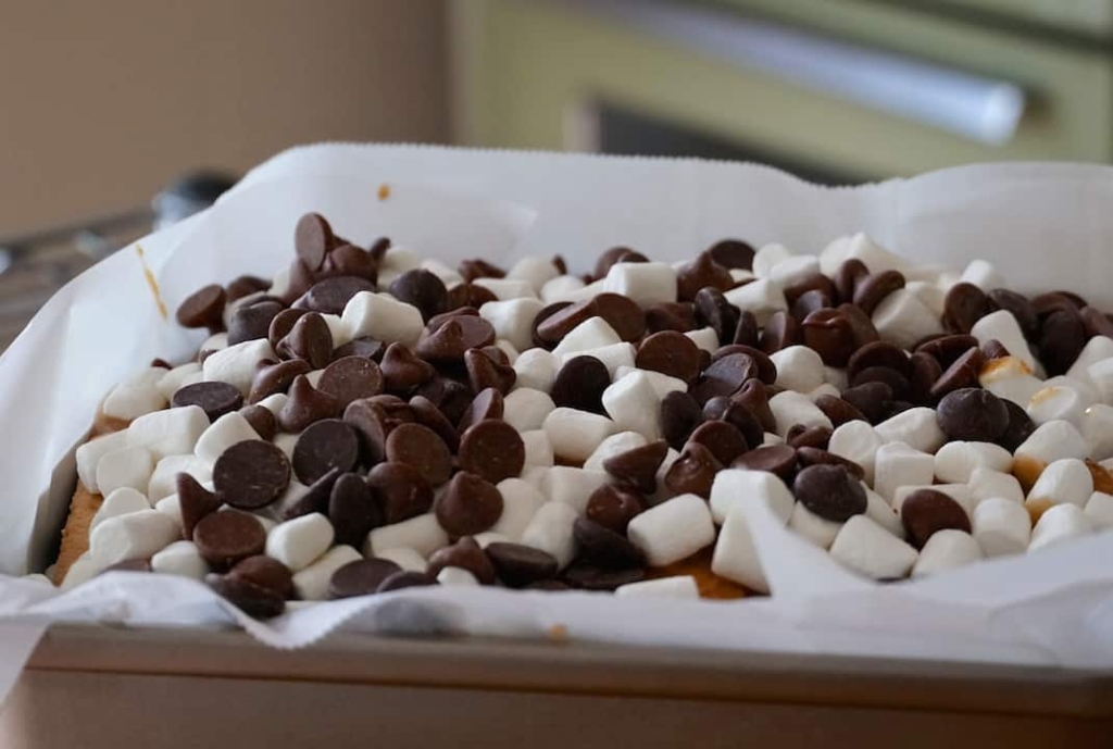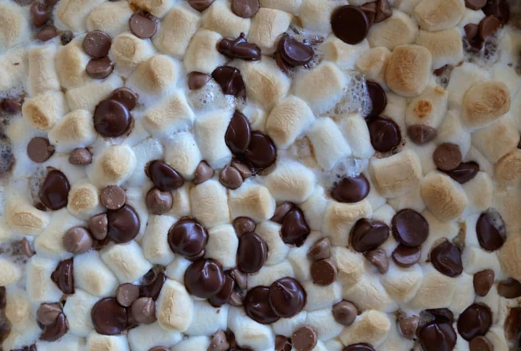 Bake for 16-20 minutes, until the marshmallows have browned on top. If serving later, cool the pan on a rack and then chill completely.