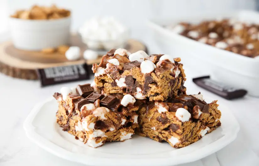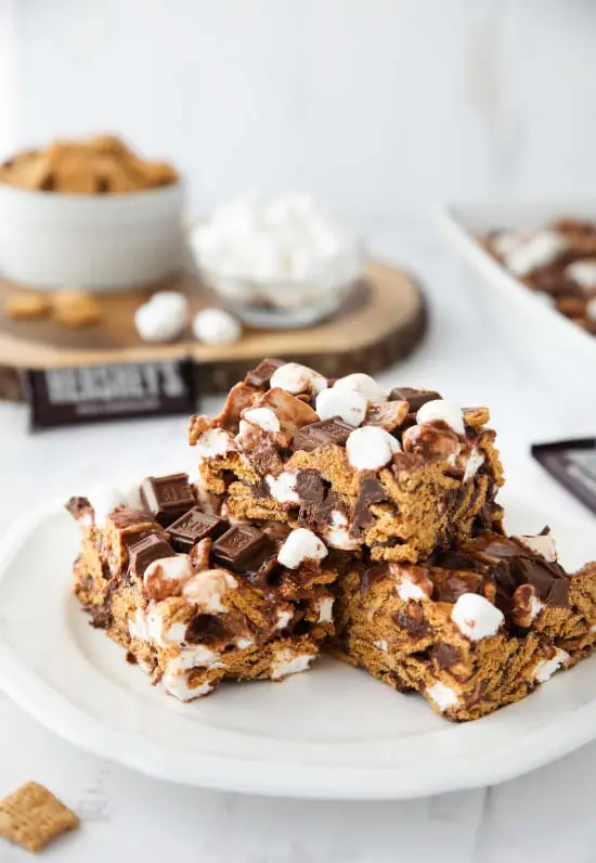 S’mores Krispie Treats have all the flavors of traditional s’mores made into an easy no-bake summer dessert. Loaded with Golden Grahams cereal, plenty of marshmallows and chocolate, these indoor s’mores bars are a crowd favorite. S’mores are fun to make and delicious to eat, but you don’t always have easy access to a campfire. These S’mores Krispie Treats combine all the flavors of a traditional s’mores: graham crackers, marshmallows, and chocolate into a chewy, gooey treat!