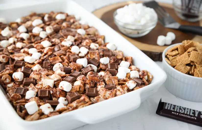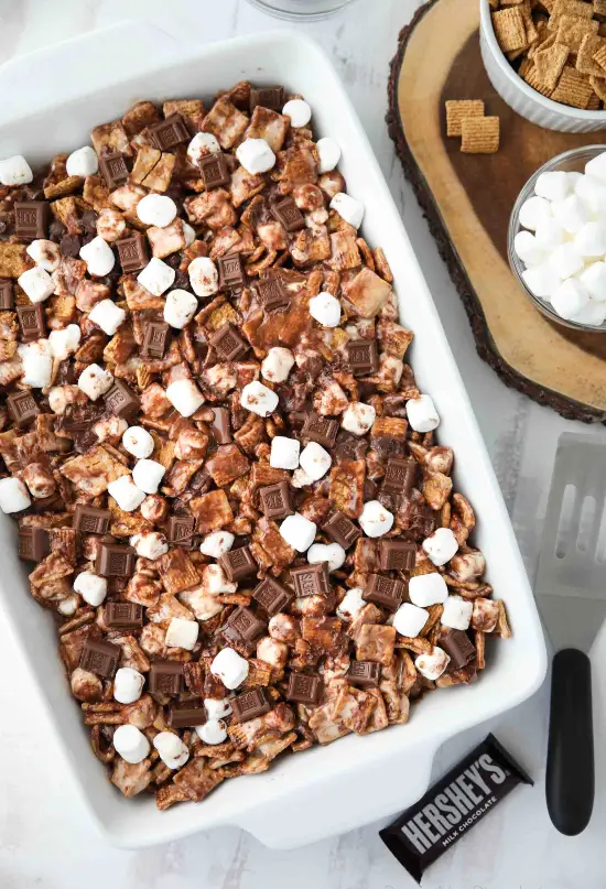 Pour the melted marshmallows over the cereal mixture. Stir until evenly coated. Pour into the prepared pan and flatten with a greased spatula or rolling pin. Separate Hershey’s squares and then cut them in half. Press the chocolate squares and reserved 1/2 cup of mini marshmallows into the top of the krispie treats. TIP: Place a layer of wax paper on top (to minimize the sticky mess) and then press or roll with rolling pin. Cool completely, then cut into squares and serve. Cover and store any leftovers at room temperature up to 5 days.
