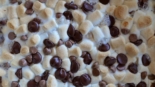 Place cereal in a large bowl. Add the chocolate chips. Remove 3 cups of mini marshmallows from the bag. Toss 2 1/2 cups of the marshmallows with the cereal and chocolate chips. Set aside the other 1/2 cup to press into the top of the bars later on.