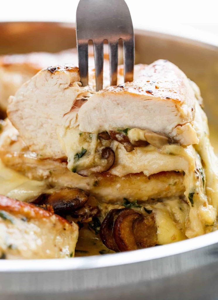 Cheesy Garlic Butter Mushroom Stuffed Chicken with an optional Creamy Garlic Parmesan Sauce! Calling all Garlic Mushroom lovers… this is the chicken recipe of your dreams! Golden, crispy chicken on the outside; juicy and buttery on the inside; filled with two different types of cheeses plus the most delicious garlic butter mushrooms. With this Cheesy Garlic Butter Mushroom Stuffed Chicken recipe, you can stop right here or continue on and make the best creamy garlic parmesan sauce of your life. The choice is… as always…. yours!