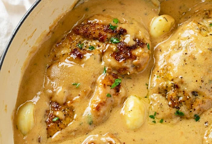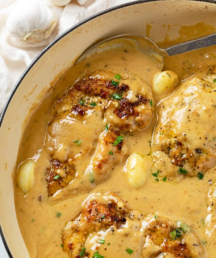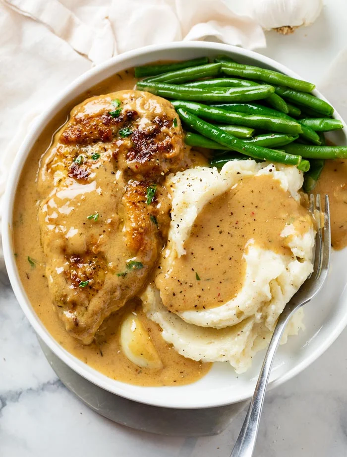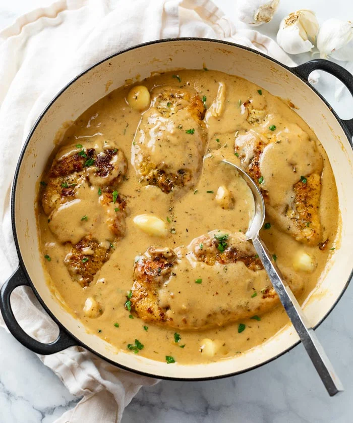 This Creamy Garlic Chicken is smothered in a rich and flavorful gravy that’s easy to make in a single skillet. Caramelized garlic cloves add the perfect balance of gourmet flavor. There is plenty of savory sauce to serve over mashed potatoes with roasted green beans. You have just found your new favorite meal!