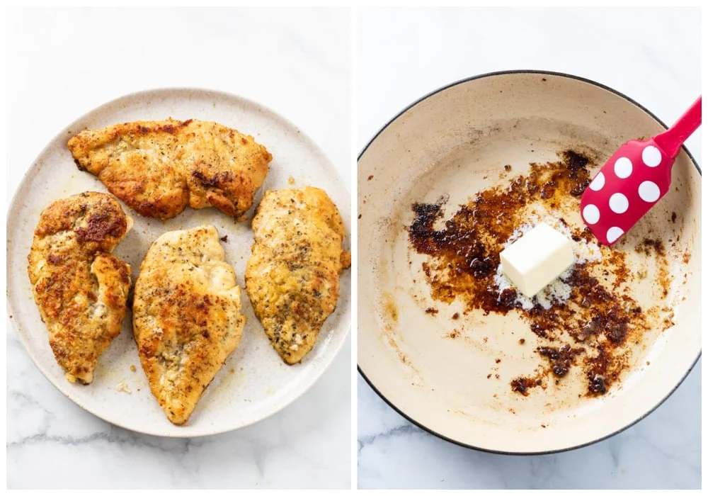 Heat olive oil in a large skillet over medium-high heat. Sear the chicken in batches for 4-5 minutes per side, until a golden crust has developed. Set aside and leave brown remnants in the pan. (See notes for key tips for searing chicken.)
