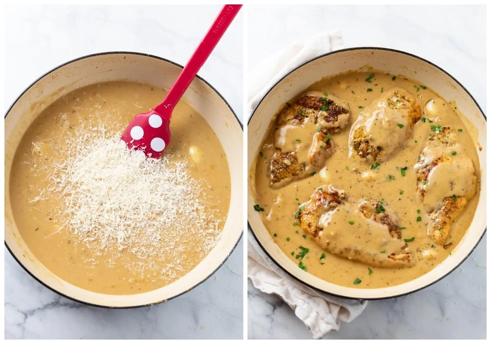 Add the chicken back to the pan along with any juice from the plate. Spoon the sauce on top. Cover and cook for 5 minutes. The sauce will continue to thicken during this time.