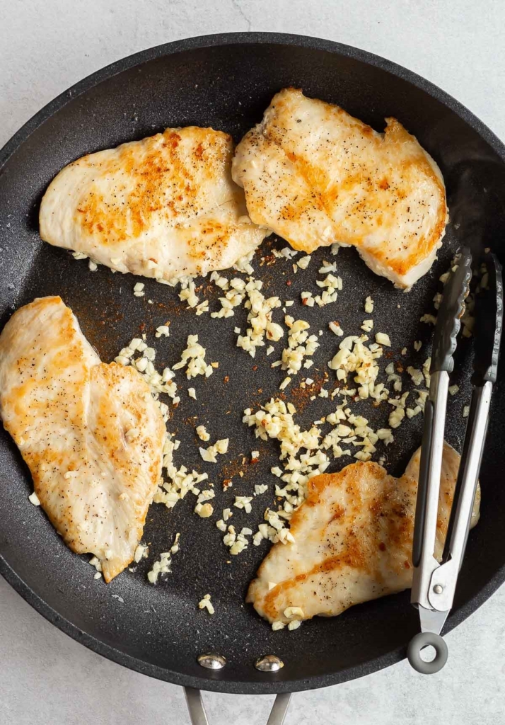 Season chicken with salt and pepper and fry on each side until golden (you might need to do two batches if your pan is small), about 3-4 minutes per side. Add the garlic to the pan and cook 1 minute until fragrant.