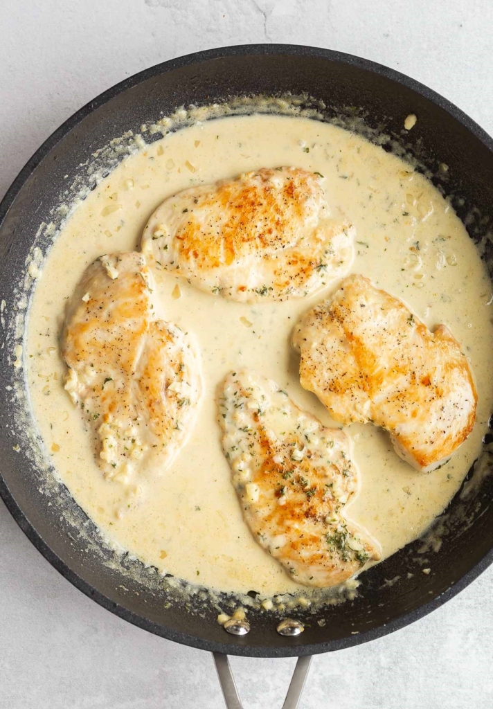 Add the cream, broth, parsley, salt and pepper. Cook and stir on medium heat until sauce is bubbly and thickened slightly and chicken is cooked through. The best way to tell if it is cooked through is to check with a meat thermometer — it should be at least 165 degrees F inside.