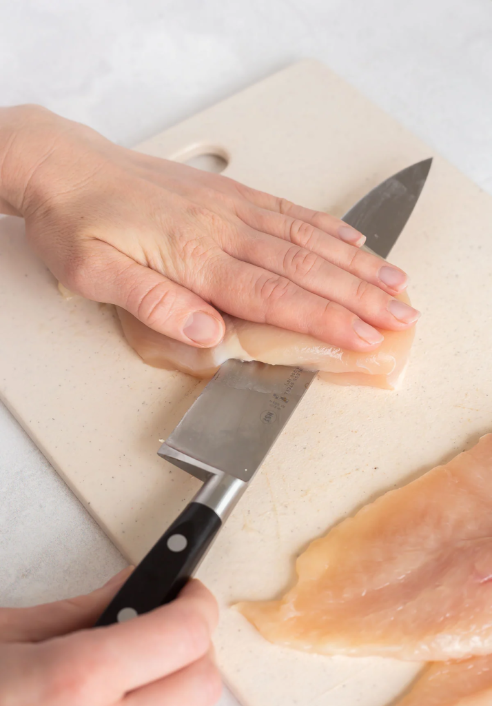 Meanwhile, split chicken breasts (butterflying them) to make two thinner pieces. Simply place your chicken breasts on a cutting board and place one hand flat on top. Use a sharp knife to cut the chicken breast in the middle all the way through.