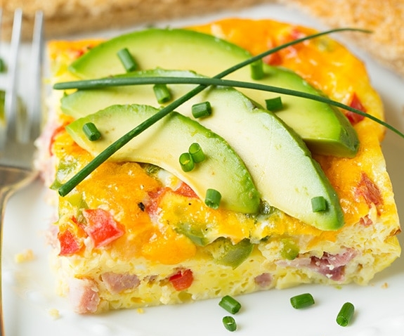 This Baked Denver Omelet is studded with bits of bell pepper, yellow onion and ham. It’s ready in about 30 minutes and requires just 5 minutes of hands-on prep! I used to make omelets all the time, but I think I stopped because now I have four people to cook for instead of just one. So now, the majority of the time I just go with scrambled eggs and I top them with sliced avocados. Now that I’ve discovered baked omelets though it’s likely going to become the way I make eggs much of the time. My whole family loved this oven baked omelet recipe and it was so easy to make. Plus, you most definitely don’t need to be a pro omelet shaper, you just add it all to a baking dish, pop it in the oven, and voila! A delicious low-carb meal your whole family will love! Not to mention this Denver omelet is a very versatile recipe. If you don’t like the veggies listed, choose some you do. And if you’d like, swap out the ham for bacon or sausage, or omit it entirely for a vegetarian omelet.