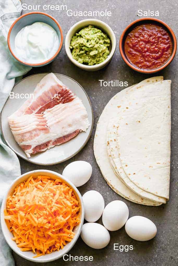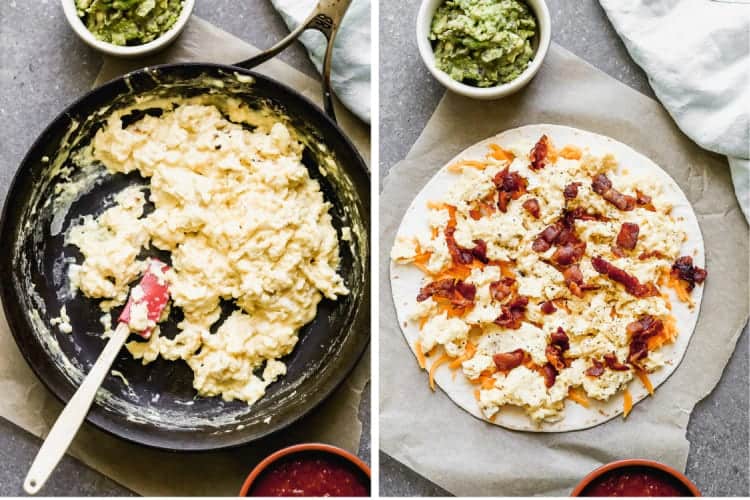 Cover one flour tortilla with a thin layer of shredded cheese. Top with some of the scrambled eggs and bacon.
