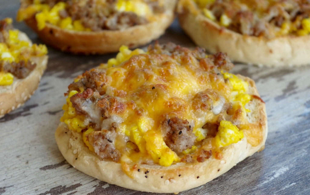 Preheat oven to 400. Cook sausage. Scramble eggs. Slice bagels open and lay on baking sheet. Sprinkle eggs and sausage on bagels. Sprinkle cheese on bagels. Bake for 10-15 minutes or until cheese is melted and slightly brown.