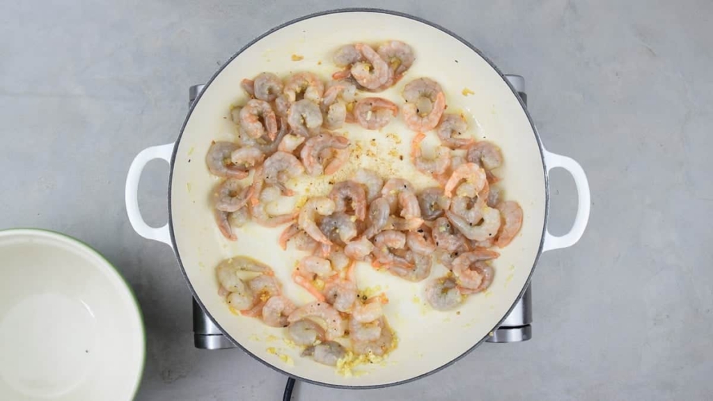 Add the shrimp and stir for 2 minutes until the shrimp turns pink. Use a large slotted spoon to remove from the pan.