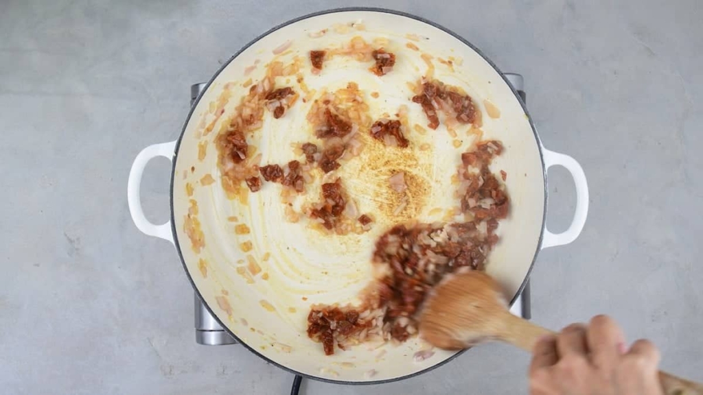 Add the butter and melt over medium heat. Sauté the onions for 5 minutes and then add the sun-dried tomatoes. Cook for a further 2 minutes then lower the heat.