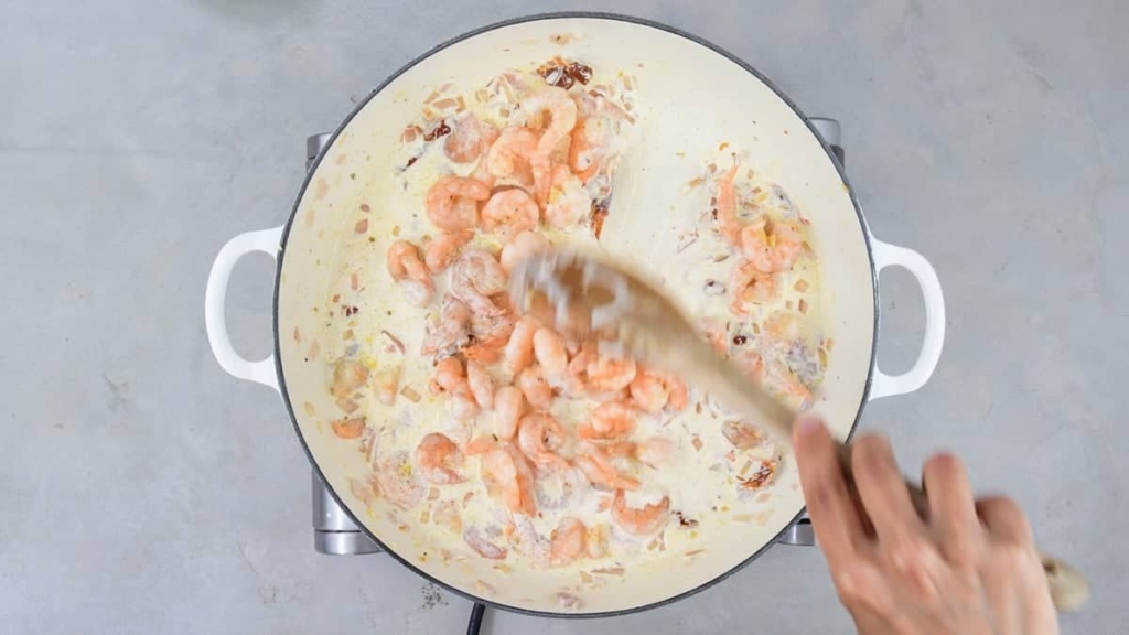 Stir in the cream, add the shrimp and bring to a gentle simmer for a couple of minutes.