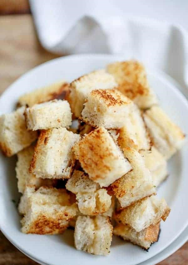 2 grilled cheese sandwiches, crusts removed and cut into bite sized cubes/croutons