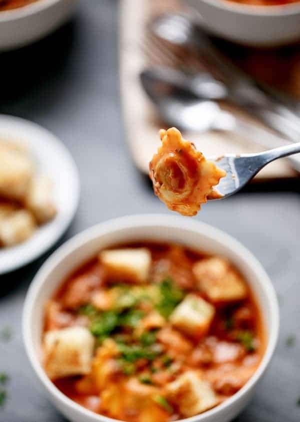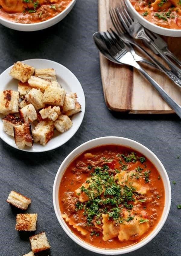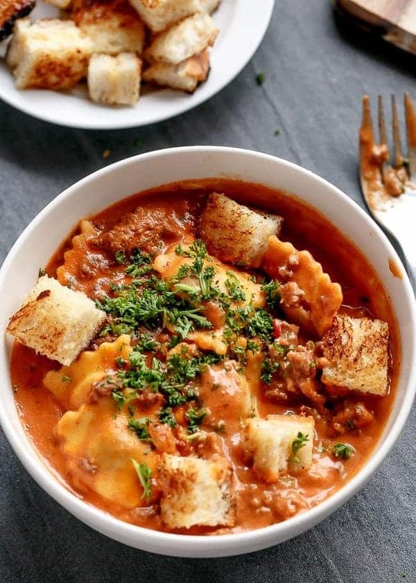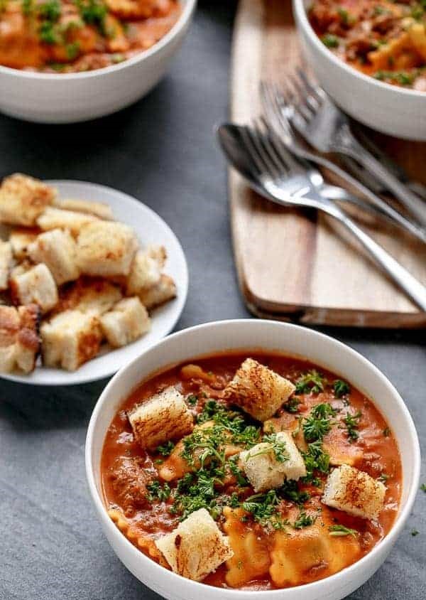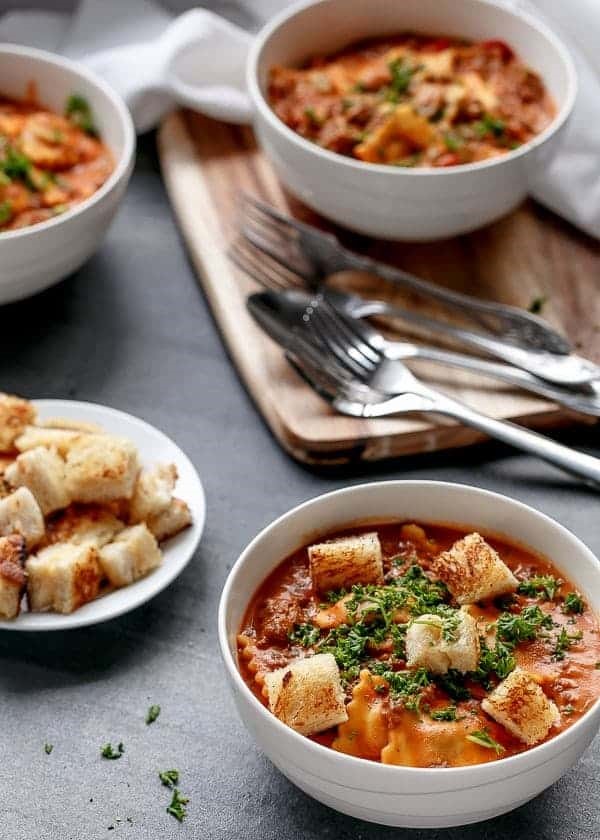 A one-pot, rich tomato based cream sauce simmered to creamy perfection, cooked with ravioli inside the sauce for extra richness and flavor. Topped with crunchy grilled cheese croutons, there were no complaints happening around the dinner table over here. Less pans means less washing up and more time to enjoy the best part – eating!
