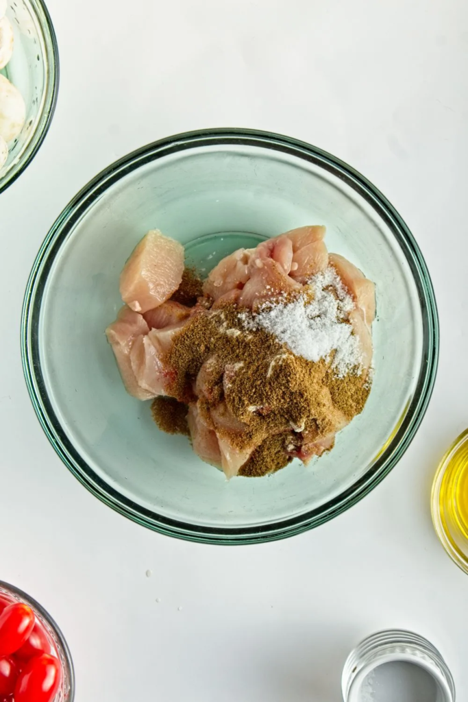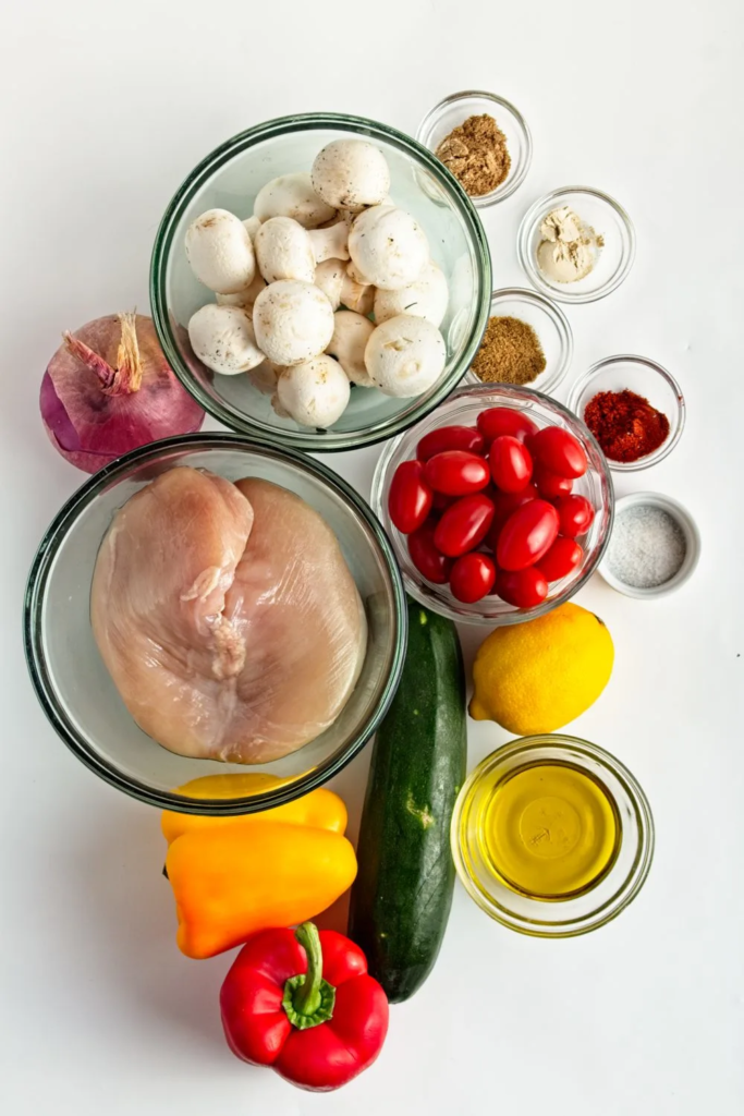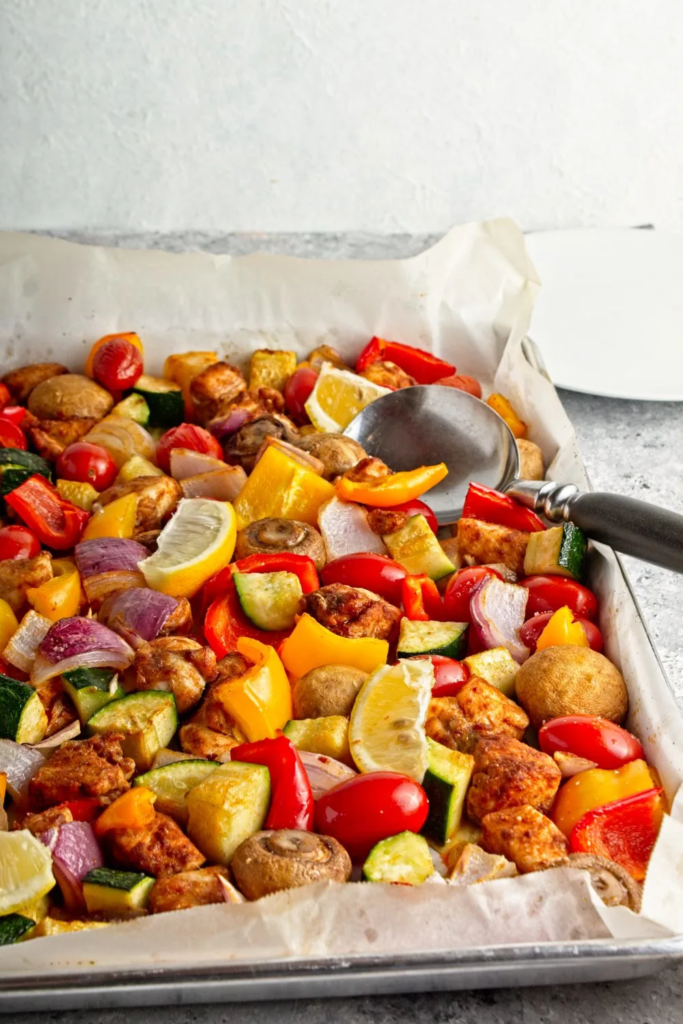 Preheat oven to 425°F (215 C). Line a baking sheet with parchment or foil. Dice chicken into 1” (2.5cm) cubes. Add to a large bowl. Wash, dry, and trim the stems off the mushrooms. Set aside. Peel and chop the onion. Slice off the ends and cut lengthwise in half. Slice each half into 8 cubes. Set aside. Cut the zucchini and peppers into about 1” (2.5cm) cubes. Wash and dry the tomatoes. Add the spices (coriander, cumin, paprika, garlic powder) and the salt to the bowl with the chicken. Toss to coat and get everything properly mixed up. Add the mushrooms, onion, and zucchini to the bowl. Drizzle the olive oil on and toss to coat everything. Spread the mix flat on the prepared baking sheet. Scatter around the tomatoes and bell pepper pieces so that everything is evenly spaced. Bake for 25-30 minutes, until the chicken is cooked through and the vegetables are slightly softened. Squeeze 1-2 tbsp (15-30ml) of lemon juice over the pan or serve with lemon wedges. Enjoy!