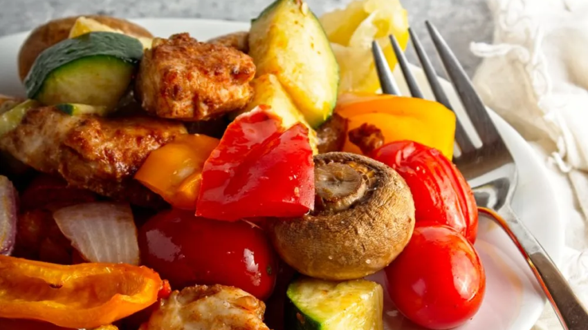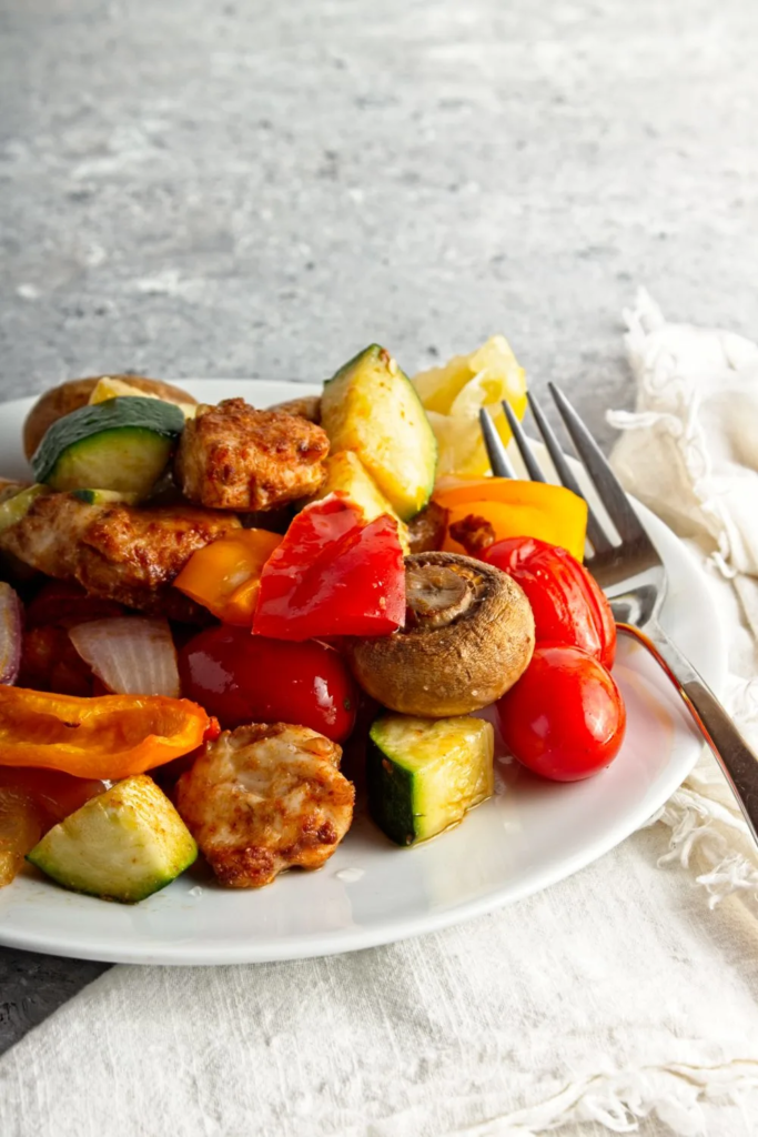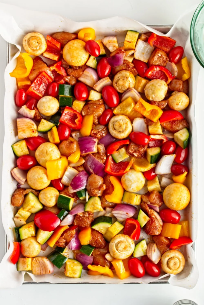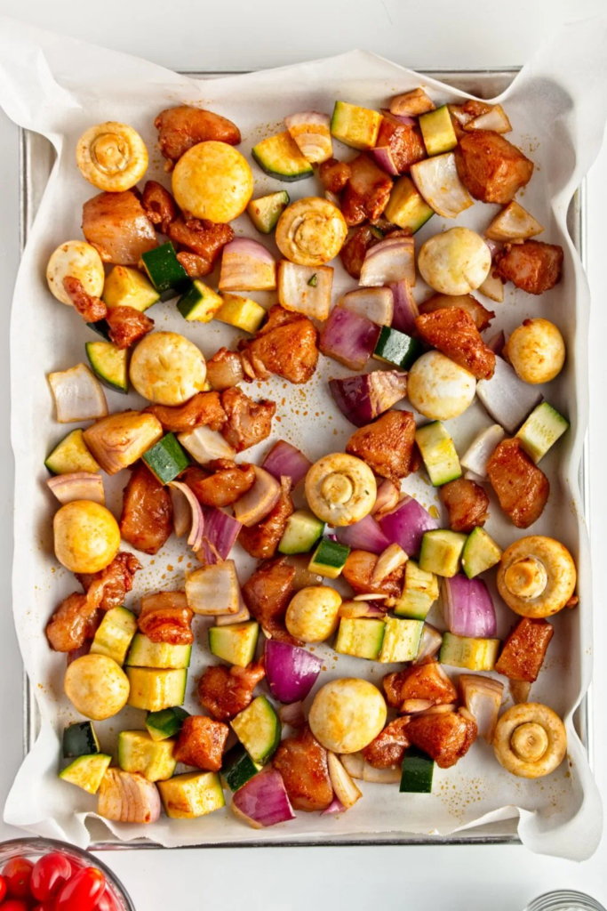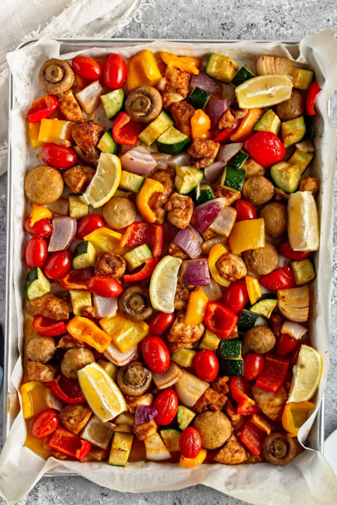 Who doesn’t love shish kabobs? Lots of flavor, super healthy, but so much work too assemble! When you make our sheet pan chicken kabobs in oven without skewers you get all the flavor of traditional kebabs without as much work – and without firing up the grill. This makes it a quick and easy weeknight meal any time. You sure can! You can make these deconstructed shish kabobs in the oven any time – and even on a busy night when you don’t have much time to cook. Our recipe takes just 15 minutes of prep! Sure, typical kabobs are beautiful and delicious – but the skewer prep makes them time-consuming – and the real treat is the flavor, no? You can bake this lightly spiced chicken with all the vegetables on a sheet pan for a quick prep meal – with easy cleanup. With this recipe you get the yummy Mediterranean chicken and veggies taste without skewers to fuss with. With our recipe it’s now an easy, quick meal that can be made any day of the week.