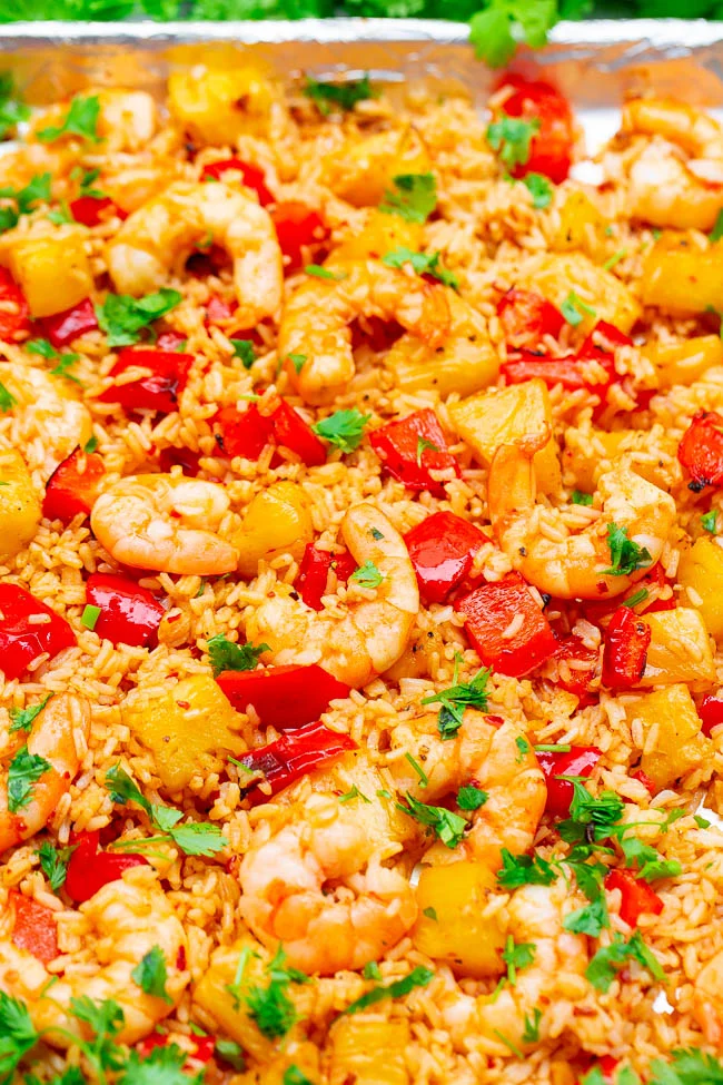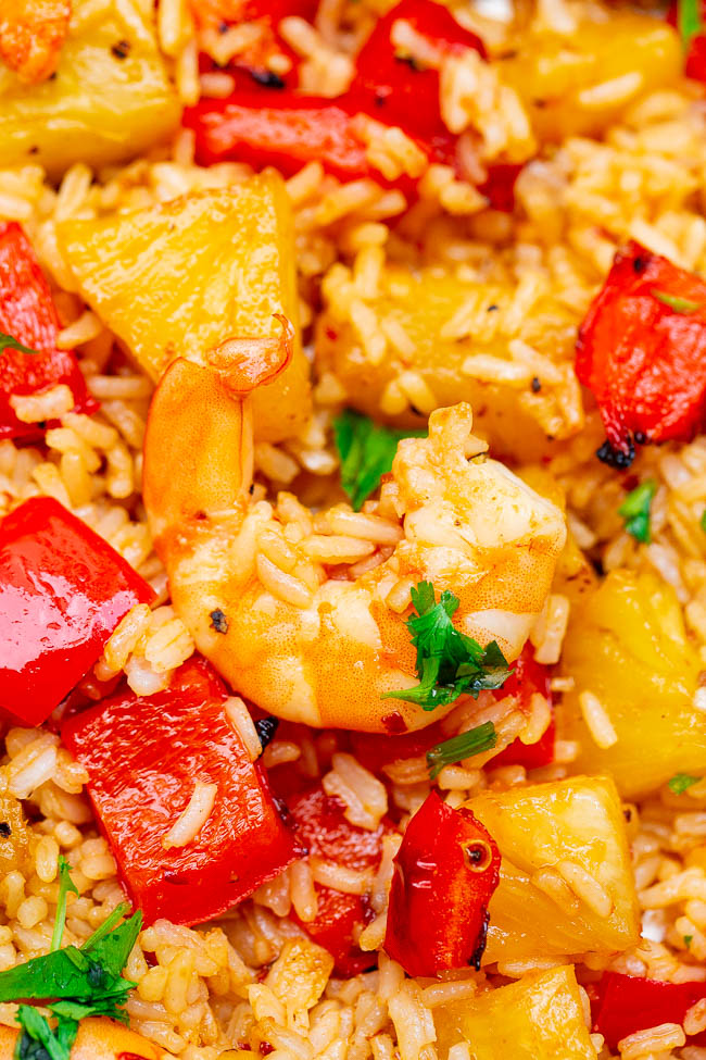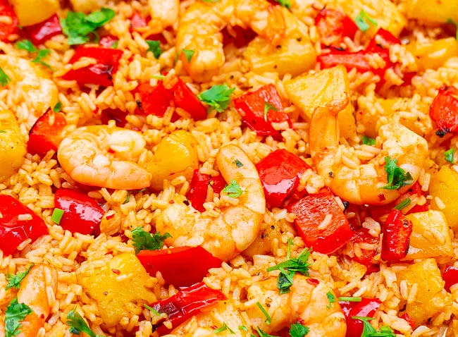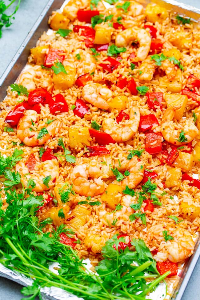 Juicy pineapple, tender shrimp, and rice with a touch of heat and tons of tropical flavor!! Made on one sheet pan, ready so fast, and perfect for busy weeknights! This sheet pan Hawaiian shrimp recipe is so easy, ready in 15 minutes, and there is a wonderful array of flavors and textures. I was eating it straight off the sheet pan because it was just that tasty.