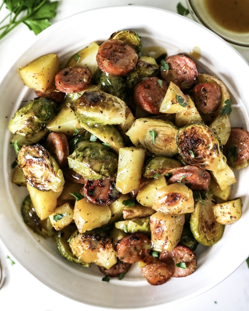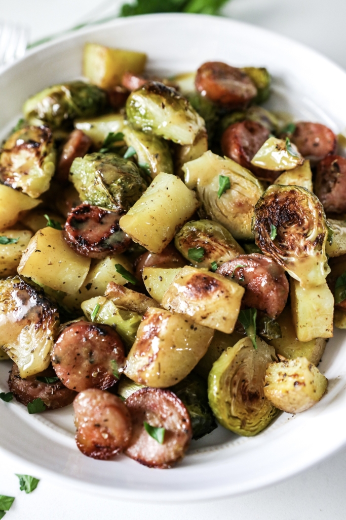This simple and delicious Sausage, Potatoes & Brussels Sprouts sheet pan recipe is not only easy to make but also requires very little clean up! It’s one of the best ways to have a complete meal ready in hardly no time. Sausage and vegetables are roasted all on one sheet pan then topped with a sweet & tangy sauce… that’s it! I definitely find myself gravitating towards easier dinner meals during the week that are healthy, filling and tastes good.