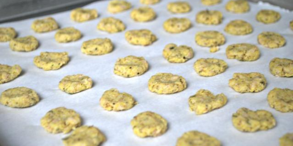 Push the dough down so the treat is the size of a nickel and place on parchment paper.