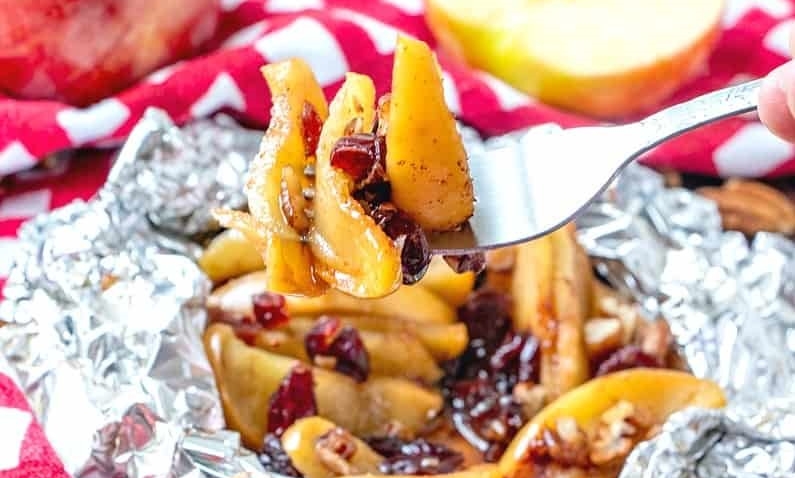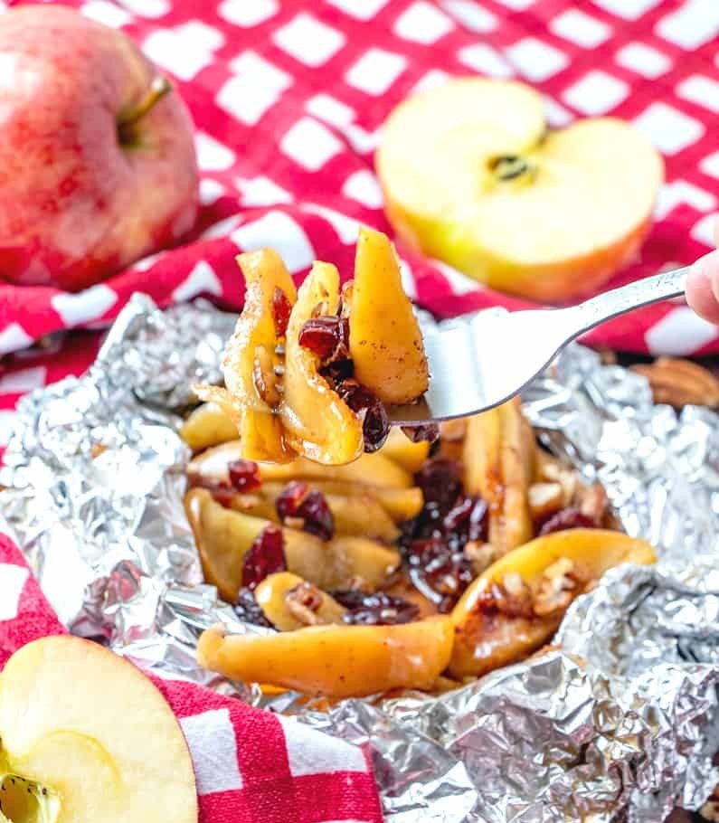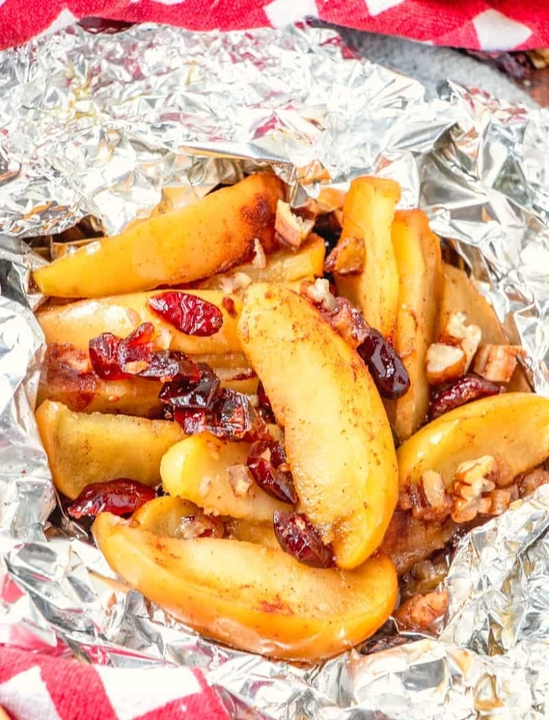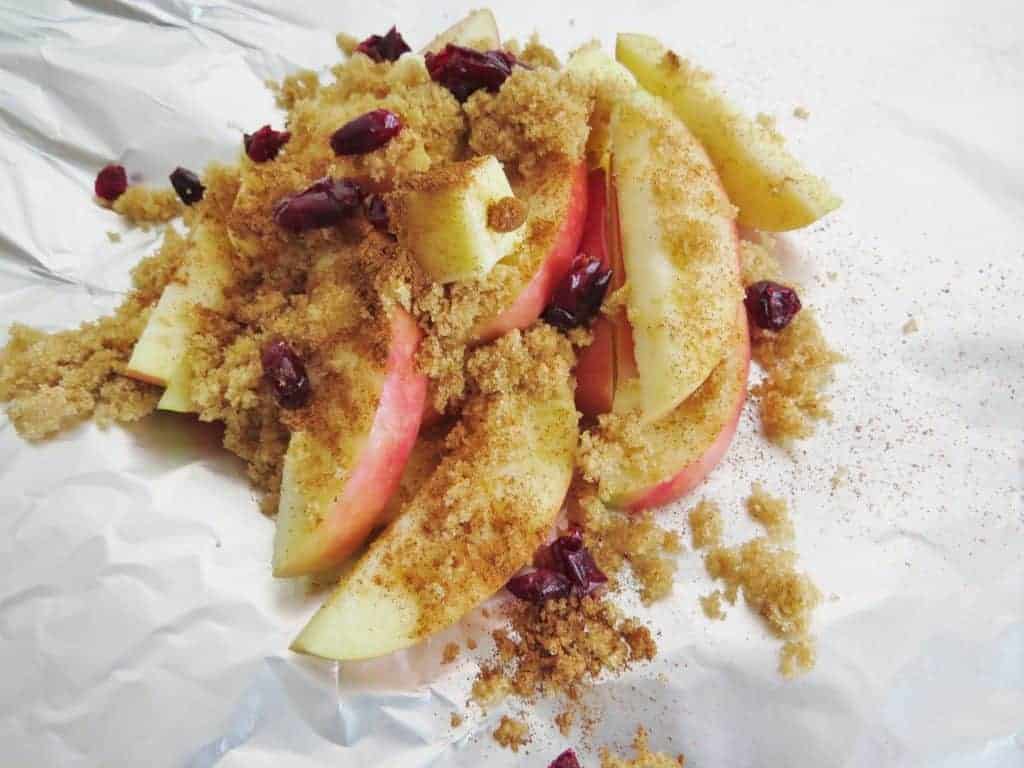 Preheat grill (to medium heat). Cut a 12 x 18-inch sheet of nonstick foil. Place apple slices on foil along with butter, brown sugar and cinnamon and dried cranberries or raisins. Wrap packet securely with double-fold seals, allowing for a bit of room for heat expansion. Place packet on grill; cover and cook for about 15 minutes over medium heat. Optionally, place on a grate over a campfire for 15-20 minutes, when it smells like pie… it should be ready.. Check the apples to see if they are tender enough for your liking, only open one packet to check, as they cook with steam! If they are done, remove them all. If not, you should be able to gauge how much longer they will need, by the tenderness of the packet you opened, probably about 5-10 more minutes.