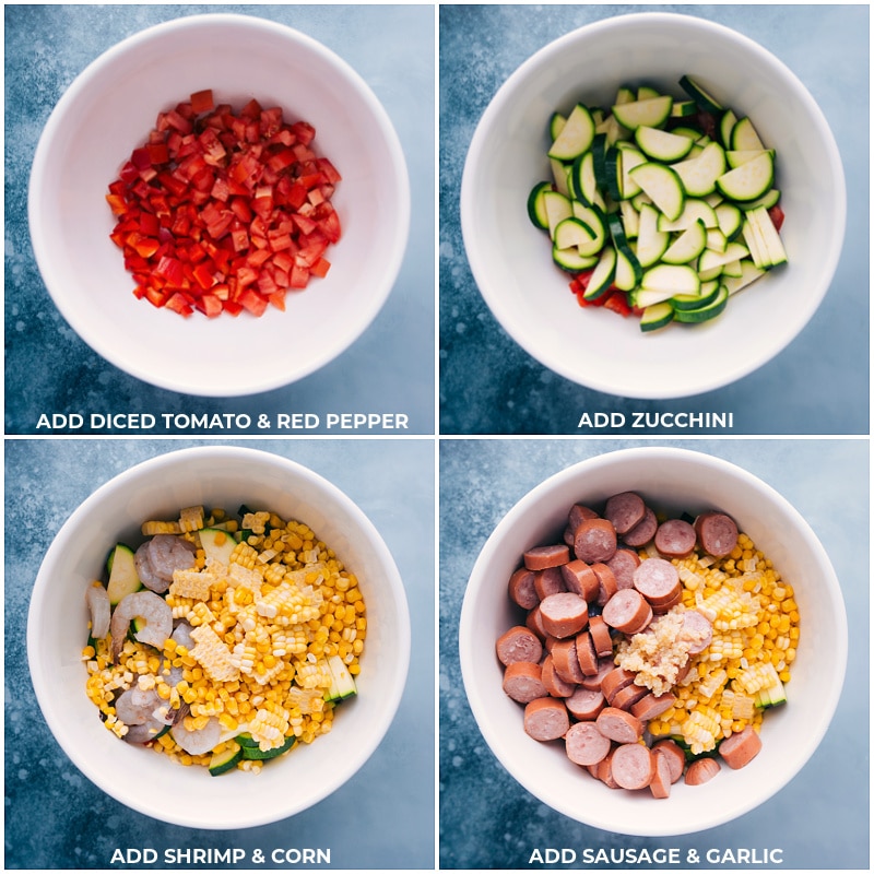 TOSS TOGETHER: In a large bowl, add in the prepared veggies, sausage, shrimp, and garlic. Add in the olive oil and all of the seasonings with seasoned salt and pepper to taste. Gently toss to ensure everything is well coated in seasoning.