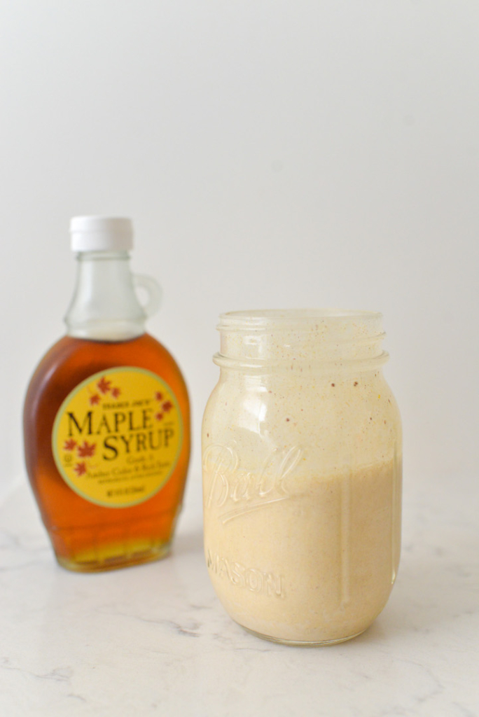 Pour all ingredients into a mason jar. Put the lid on, and shake vigorously until combined. You can adjust the ingredients slightly based on your personal preferences for sweetness and spice. Add maple syrup for more sweetness, if desired. Store in the refrigerator for up to two weeks. Shake very well before each use.