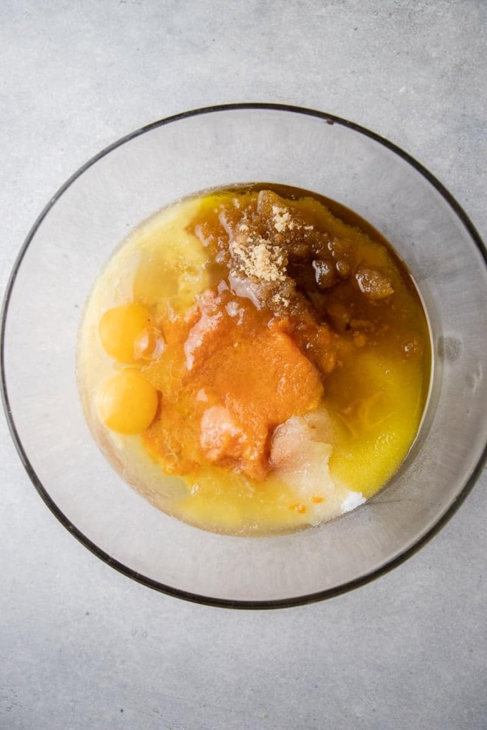 In a medium bowl, combine the pumpkin puree, olive oil, butter, vanilla, egg, brown sugar, and granulated sugar and whisk until smooth.