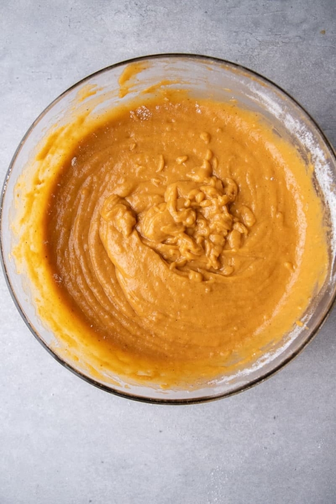 Add the flour, pumpkin pie spice, baking powder, and sea salt. Stir the mixture just until combined. Do not overmix.