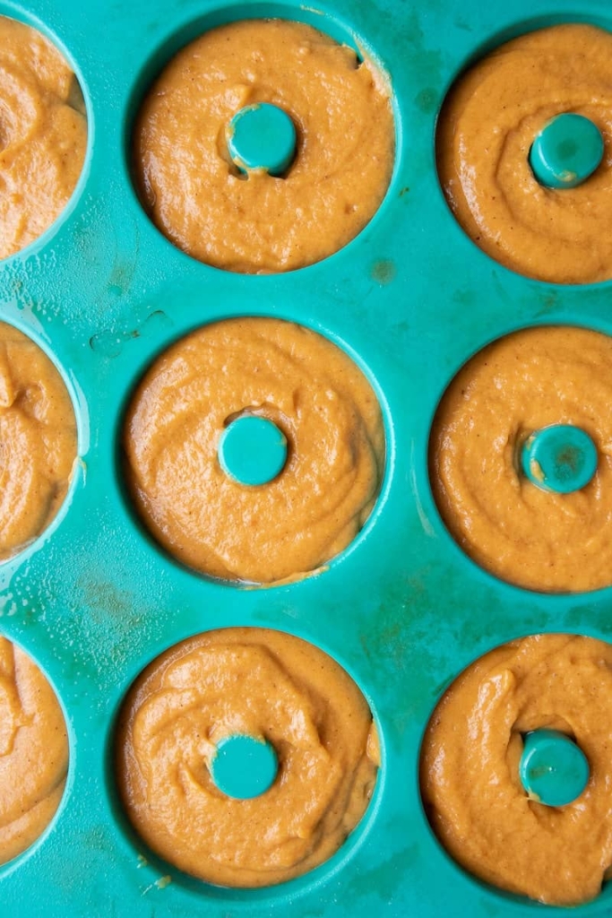 Place the batter in a piping bag or a plastic bag over a cup and transfer the donut mixture to the bag. If using the plastic bag method, snip off one of the corners and “pipe” the batter into the prepared donut pan. This recipe should make 8 large donuts.
