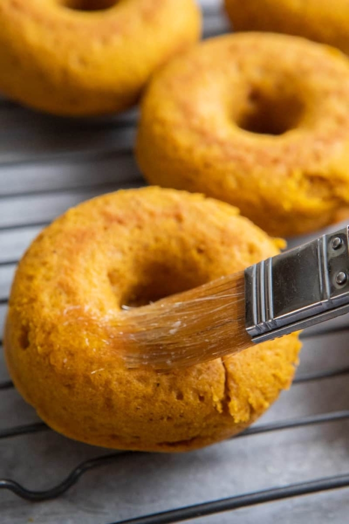 When the donuts are completely cool, melt the butter and brush each donut with the melted butter. Making sure to get every corner of it. One by one dip the donuts in the cinnamon sugar to coat them.