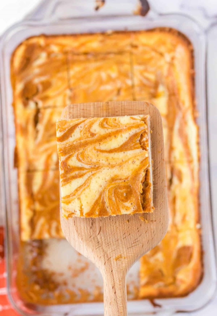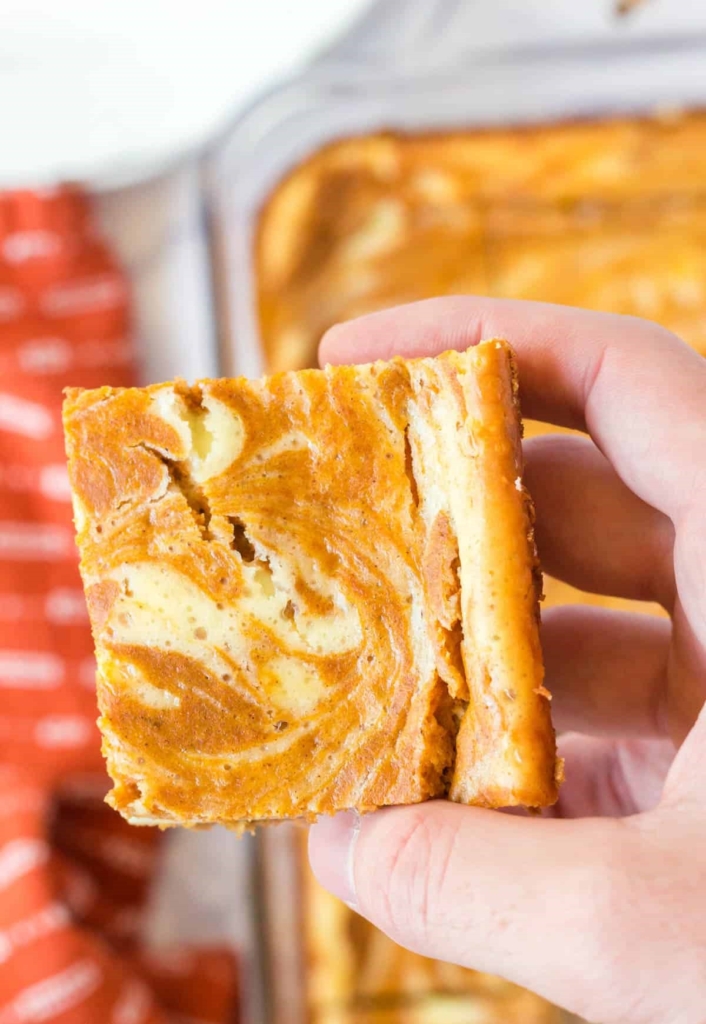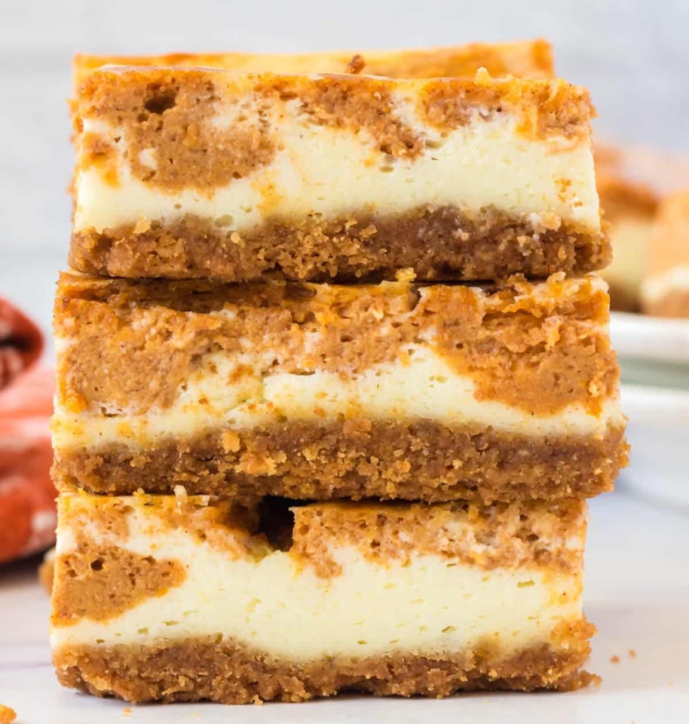These decadent Fall dessert bars feature a buttery graham cracker crust and a layer of rich creamy swirled pumpkin pie cheesecake! The pumpkin combined with the cheesecake flavors, is a combo that’s hard to pass up. It’s pumpkin season! Get ready for all of the pumpkin recipes, pumpkin treats and pumpkin flavor. These pumpkin bars are no exception. They have a generous swirl of pumpkin pie cheesecake that will cure that pumpkin craving. Since this cheesecake is baked in a 9×13 baking dish, you don’t have to fuss with a springform pan or a water bath. These easy cheesecake bars are a delicious alternative to pumpkin pie for Thanksgiving dessert. I know we’ll be making them all holiday season!