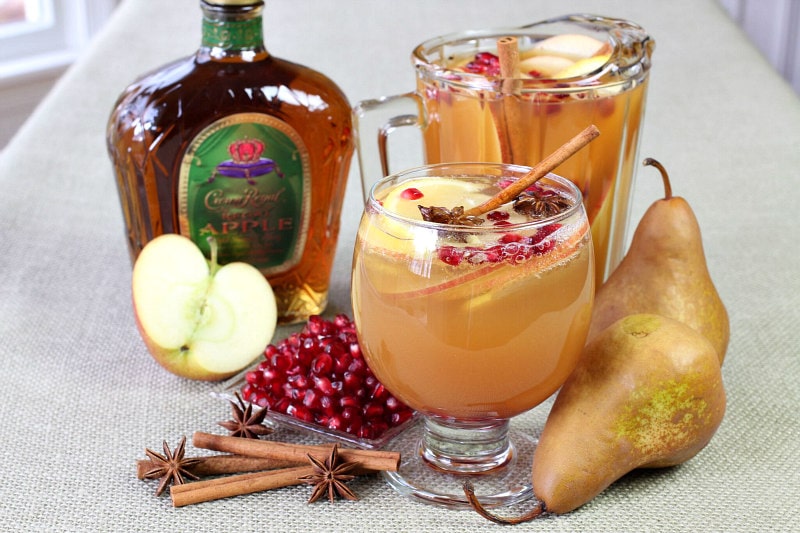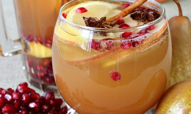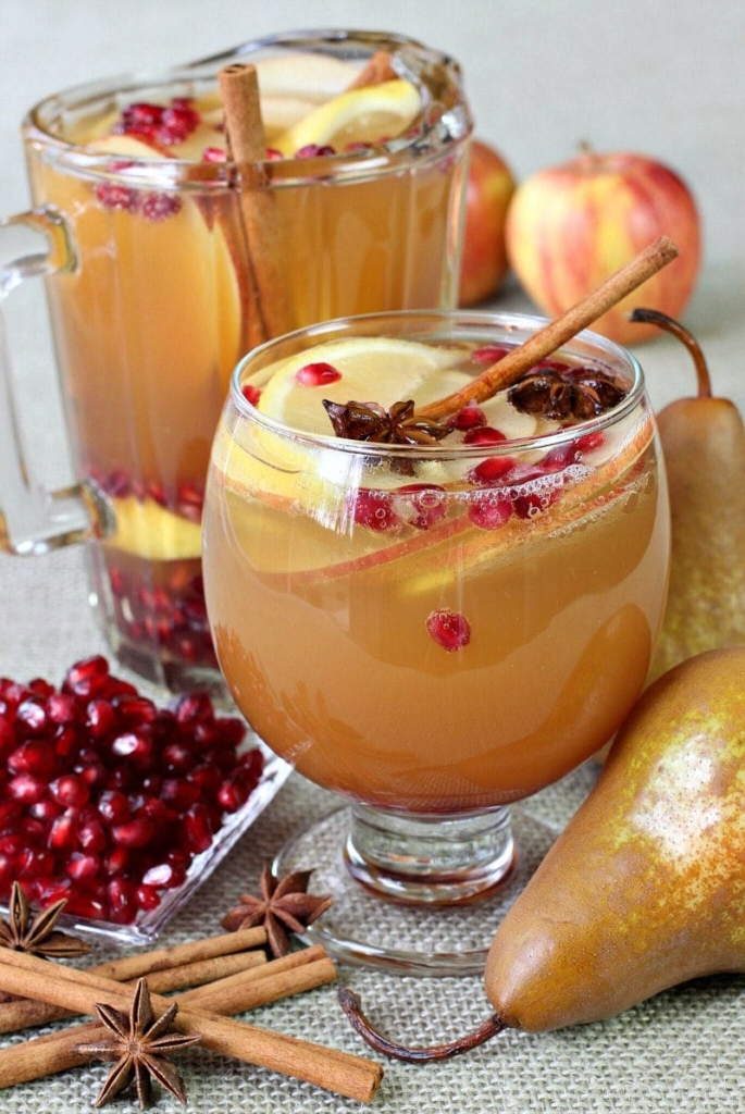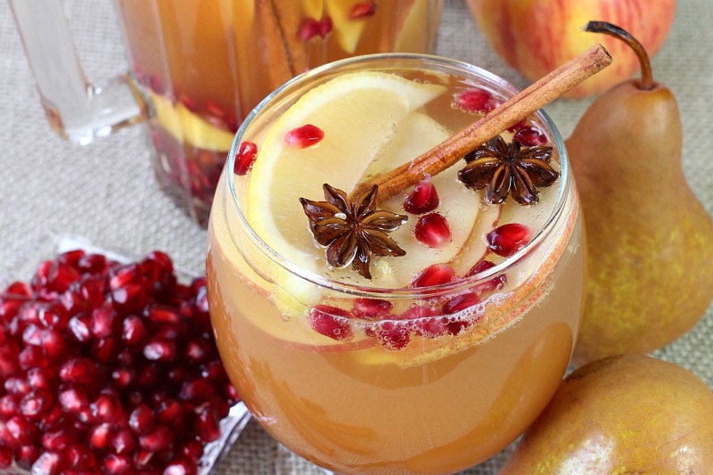 To a large pitcher, add pear, apple, lemon and pomegranate seeds. Pour apple cider into the pitcher, followed by apple whiskey and brandy. Refrigerate for a few hours, and then add the sparkling wine right before serving). Pour chilled sangria into glasses, making sure to get plenty of fruit in each glass. Garnish each glass with a cinnamon stick and a star anise.