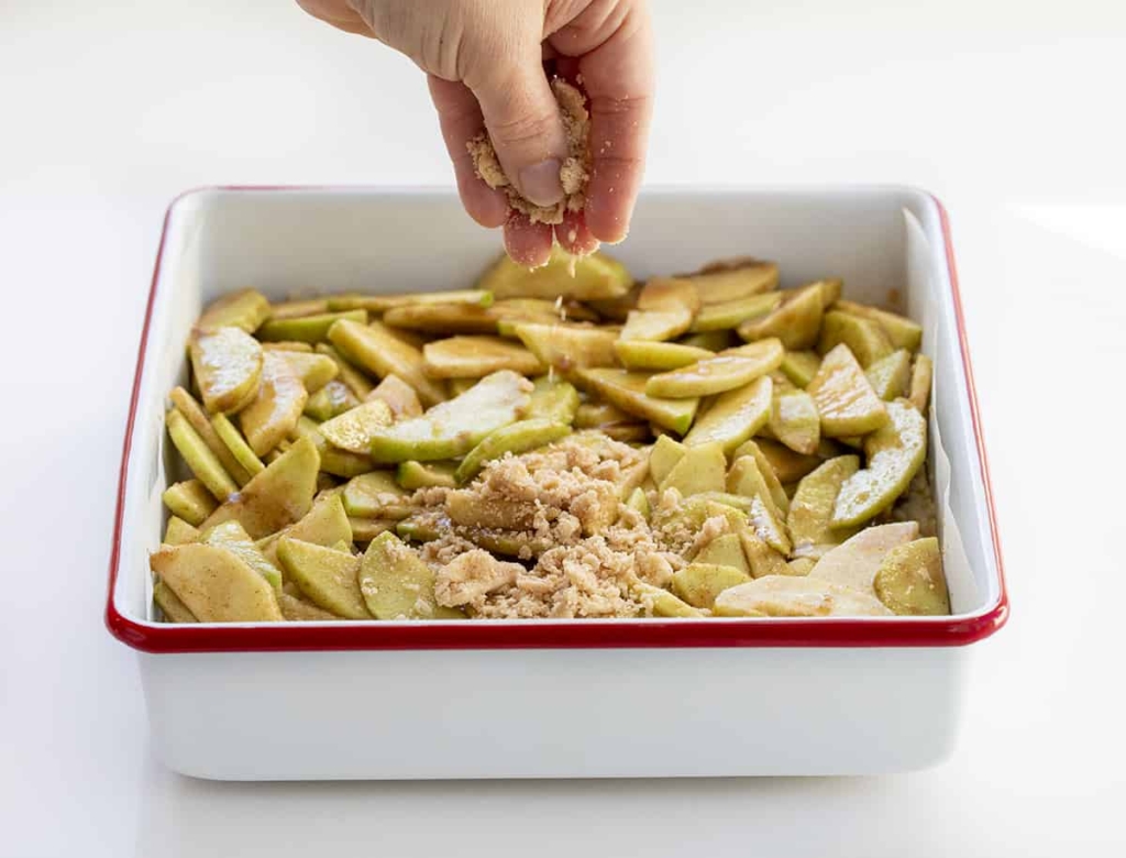 Bake for 15 minutes. While the shortbread is baking, prepare the apple mixture and the crumble topping.