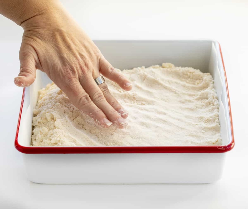 Place the butter cubes in the flour mixture. Mix by hand until the dough is light yellow in color and small crumbs form, rubbing any remaining butter bits into the flour mixture.