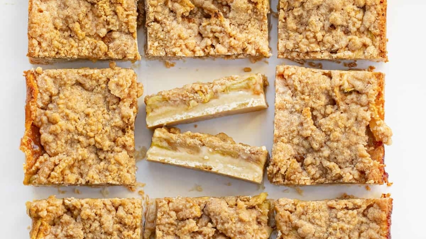 Apple Shortbread Bars are layered dessert bars with a shortbread crust and a layer of spiced apples covered and baked with crumble topping. It’s the perfect holiday dessert that should definitely be added to your Autumn menu! This dessert starts with my perfected shortbread recipe. Then, a layer of spiced apples from my apple crisp recipe is layered on top of the shortbread. Finally, the crumble topping is added and baked to a golden brown. As an added touch of flavor, you could drizzle some caramel sauce over the top of the baked bars.