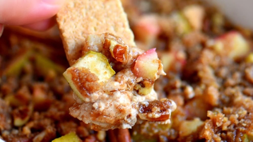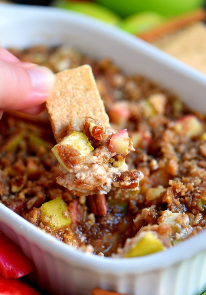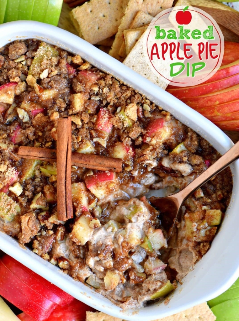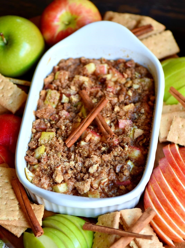 This easy Baked Apple Pie Dip is made with fresh apples, cream cheese, brown sugar and spices! Topped with a pecan-graham cracker streusel, it’s perfect for a party, after-school snack or easy dessert. This is one recipe I plan on making every chance I get! It takes about 6 minutes to pull together. Maybe 5 if you’re fast. It bakes up in about 15 minutes and the aroma from the oven will have you drooling long before you pull it out to enjoy. The first bite is magical. My family just kept repeating oh my gosh, oh my gosh as they squealed with delight. I couldn’t blame them. I mean, it’s like 800 times better than apple pie. PLUS…dippers!