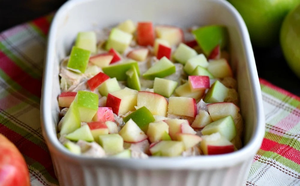 Stir in ¾ cup chopped apples. Spread the mixture onto the bottom of the prepared dish. Sprinkle remaining apples on top. Top with streusel mixture. Bake 12 to 15 minutes or until heated through. Serve with graham crackers and apple slices.