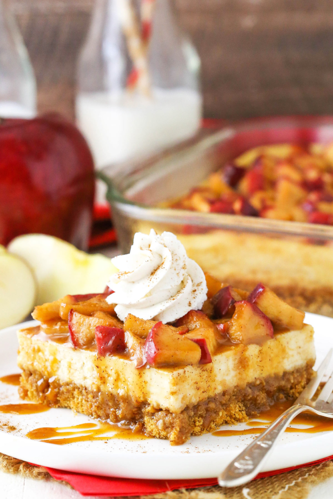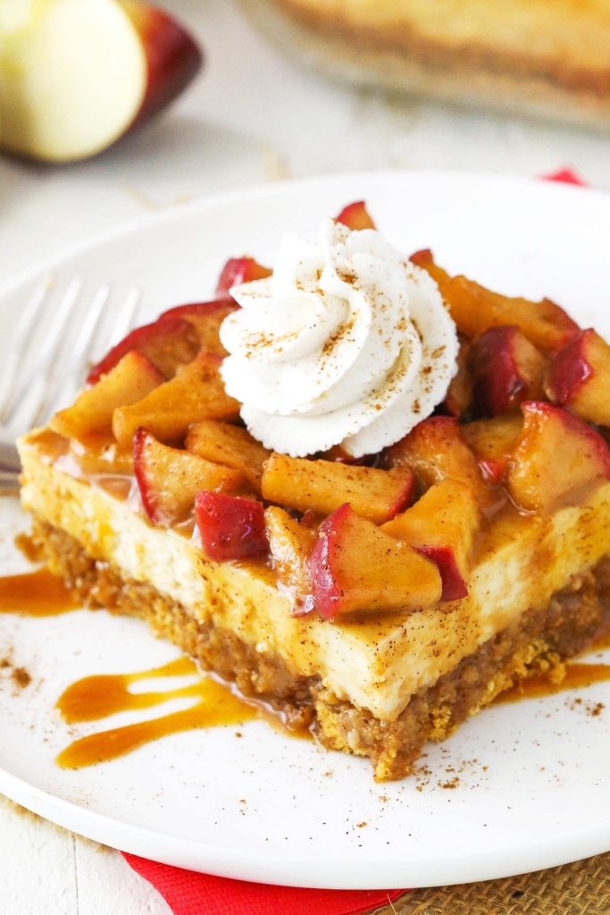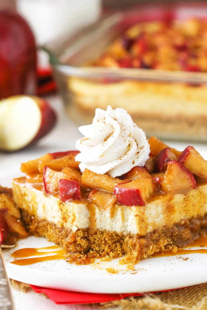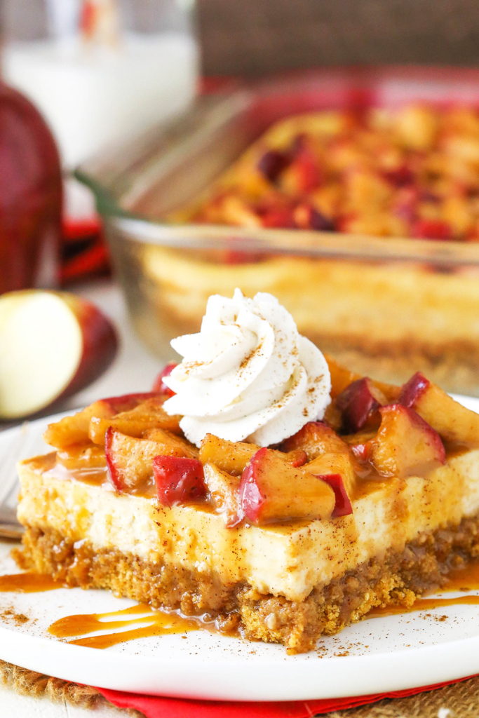 This Caramel Apple Cheesecake has a crunchy graham cracker crust, a smooth and creamy cinnamon cheesecake filling and an irresistible caramel apple topping. Add a dollop of homemade whipped cream and you’ve got yourself an incredible fall dessert! Move over, pumpkin pie – there’s a new Thanksgiving dessert in town. This caramel apple cheesecake is loaded with a heavenly combination of autumn flavors. Unlike a traditional baked cheesecake that’s made in a springform pan and requires a water bath, this one comes together in a standard baking dish. And it has that same thick and creamy texture you’re craving! Not only that but it’s flavored with cinnamon to complement the gooey homemade caramel apple topping. The crust and the whipped cream also have some cinnamon in them to bring everything full circle. Perfectly suited for making ahead of time, this festive cheesecake will become a dessert tradition every fall. Bring on the caramel apple goodness!