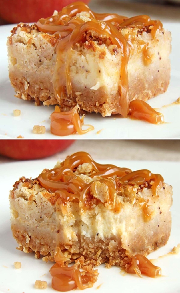 Preheat your oven to 350F. Prepare one 9×13-inch glass pan by greasing thoroughly with butter or baking spray, or light-colored metal baking pan with foil, (be sure to cover the sides, you are going to use this to lift the bars). In a mixing bowl combine graham cracker crumbs, rolled oats, melted butter and brown sugar together. Press inside the bottom of a 9×13-inch baking pan. Bake for 5 minutes. Remove from oven to cool. Meanwhile in the bowl of your electric mixer blend together cream cheese, brown sugar, white sugar, cinnamon, ginger, cornstarch and vanilla. Once well combined, pour on top of your graham cracker/oat crust. To start your apple layer, arrange the thinly sliced apple on top of the cream cheese mixture in a single layer. Top with the Apple Crisp Topping. Bake at 350F for 40-50 minutes. Once it’s done cooking, cool for 15 minutes, then refrigerate overnight. Cut into squares. Serve with caramel drizzled over the top of cheesecake bars.