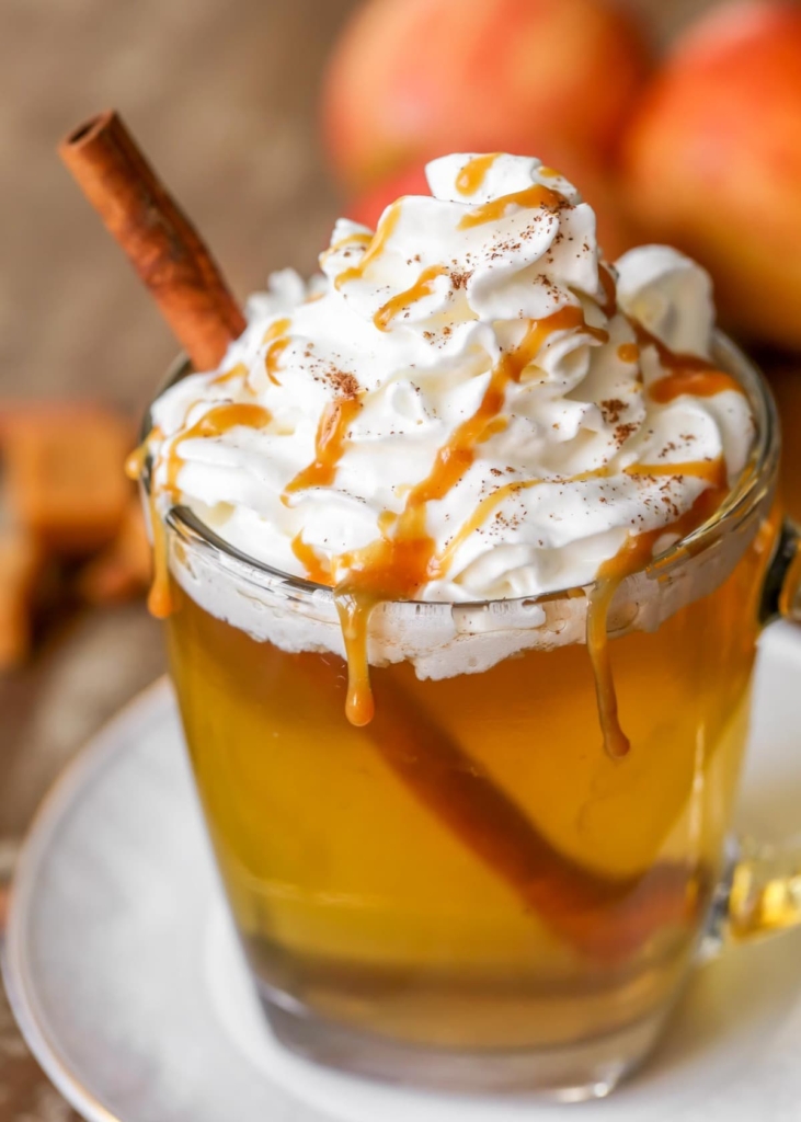 All the best fall flavors come together in this hot Caramel Apple Cider. It tastes just like Starbucks Caramel Apple Spice! There’s no better way to warm up on a cool fall day than a warm drink like delicious Hot Cocoa or this caramel apple cider!! My favorite season is Autumn!! I love all the typical things like fall colors, leaves, and sweater weather, but I also love the drinks like hot chocolate and apple cider. Today we’re kicking things up a notch by making Caramel Apple Cider. Some people call this drink Caramel Apple Spice, because it tastes a lot like the one from Starbucks. We used regular apple cider and added caramel syrup (the kind you mix with drinks), lemon juice, and pumpkin spice, then topped it with whipped cream and caramel syrup topping (the thicker kind you put on ice cream). I loved the caramel part the best, and I think you’ll love it too. It’s really easy to make and is perfect for fall events, like Halloween!! If you love warm, delicious drinks you’ll love this one too.