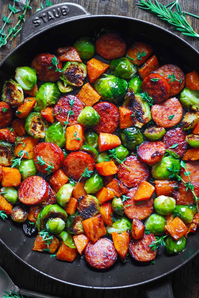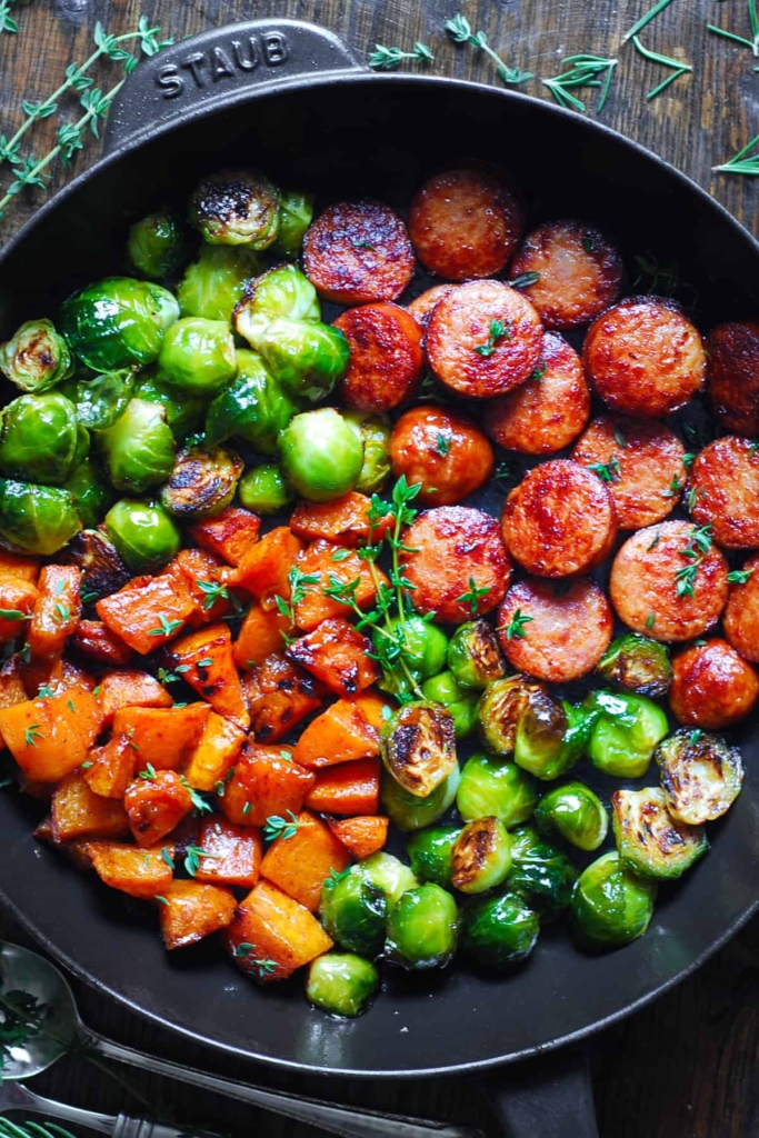 While you roast the veggies, proceed with the rest of the recipe. Heat 1 tablespoon olive oil in a large, high-sided cast-iron skillet (or stainless steel) on medium heat. Slice cooked sausage into coins and add to the skillet. Cook on medium heat in a cast-iron skillet for 5 minutes on one side, then flip over and cook for about 3 minutes on the other side. Add roasted butternut squash, roasted Brussels sprouts, and fresh snipped thyme to the skillet with cooked sausage. Mix everything to coat the veggies with juices from the sausage. Season with more salt and pepper, and a small amount of smoked paprika (you don’t need to use much), if desired.