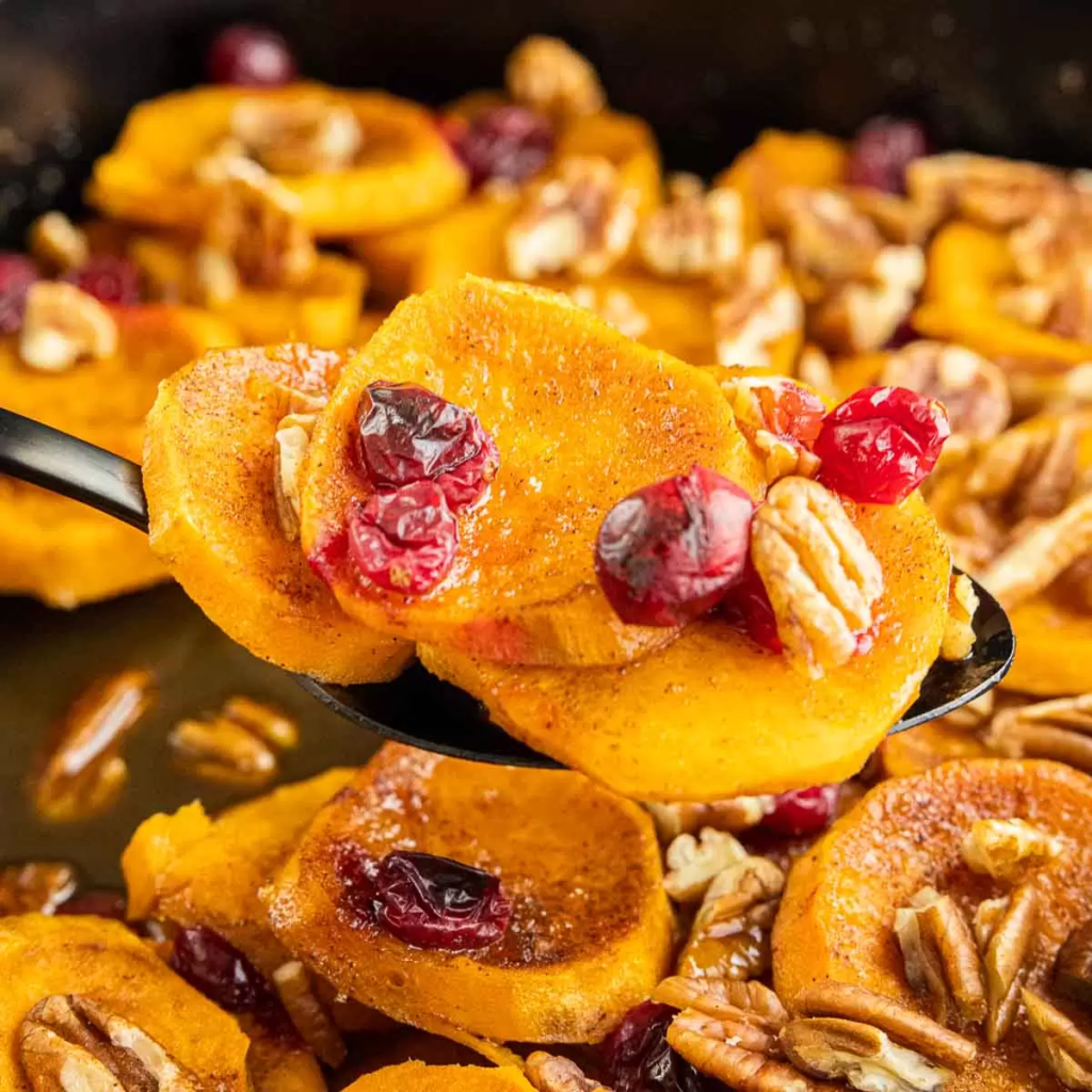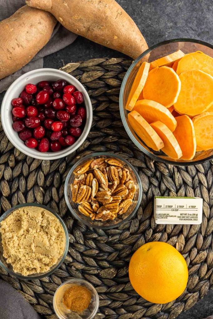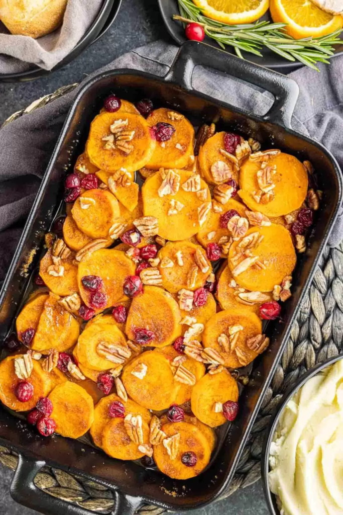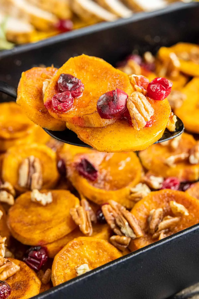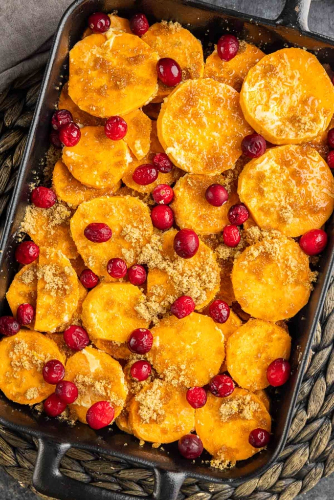 Cranberry sweet potato casserole is our updated take on candied sweet potatoes with the sweet and tart flavors of orange, cranberry, and cinnamon sugar. It’s a delicious change from the traditional marshmallow casserole for holiday dinners. This cranberry sweet potato casserole is somewhere between scalloped potatoes and candied sweet potatoes. We love sweet potatoes and while the traditional sweet potato casserole with marshmallows or plain old baked sweet potatoes are delicious we like stepping it up a little during the holidays. For this dish we cut the sweet potatoes into thin slices like you would for scalloped potatoes and then baked them with fresh cranberries, orange, and cinnamon sugar that creates this amazing juice for them to cook in just like traditional candied sweet potatoes.