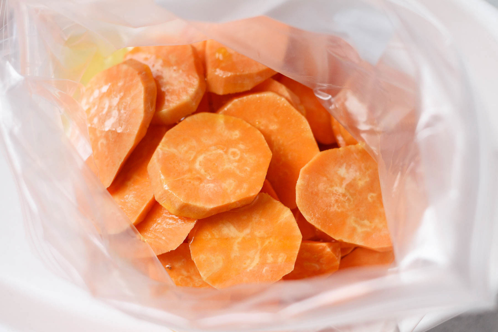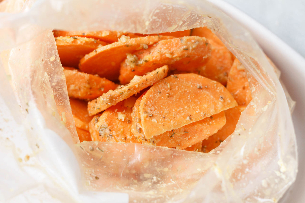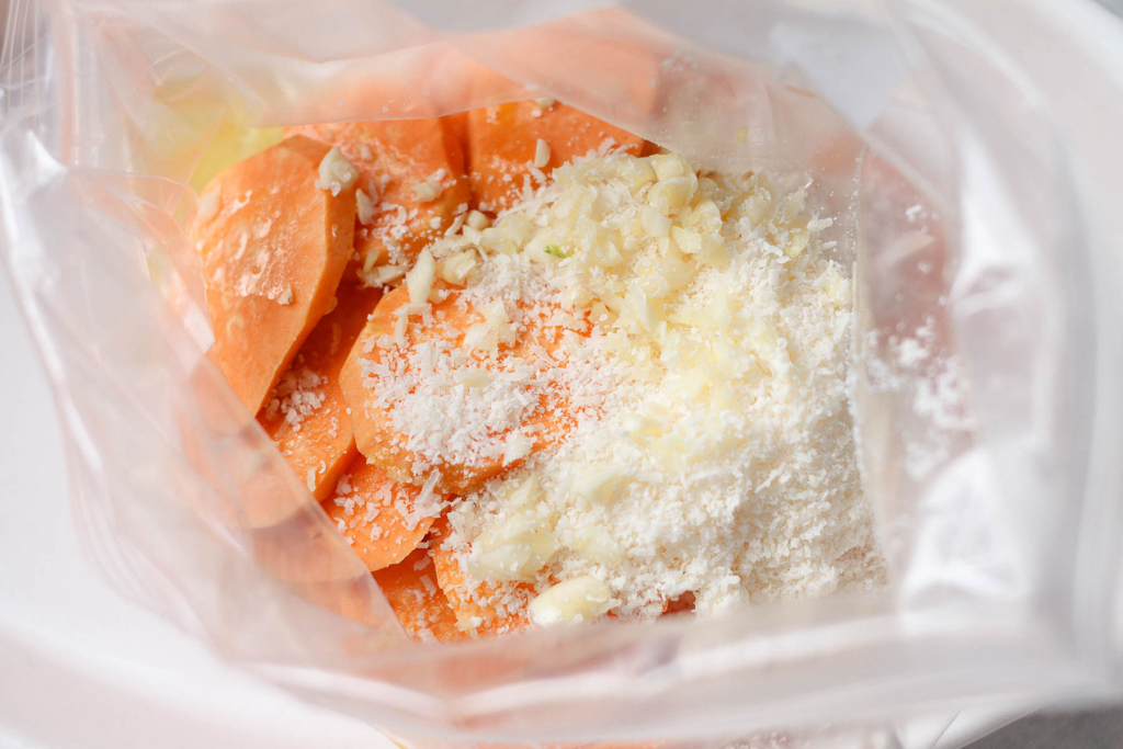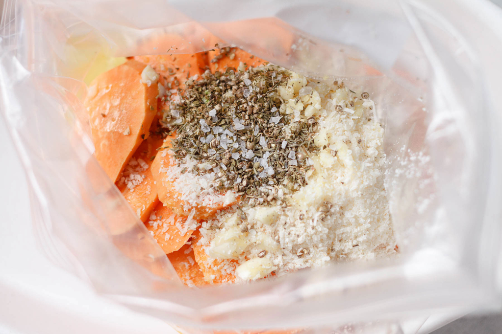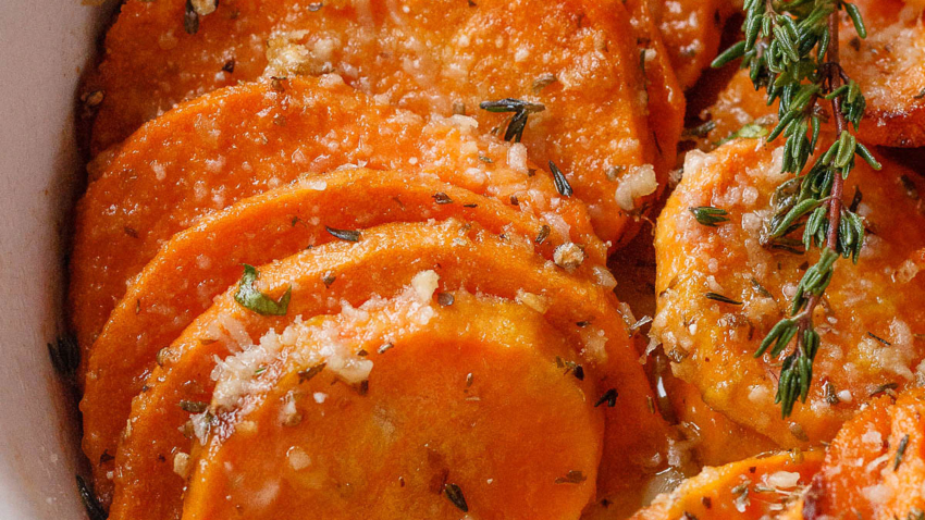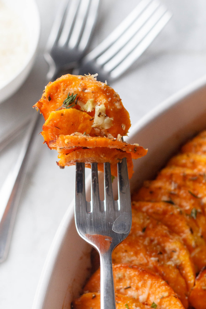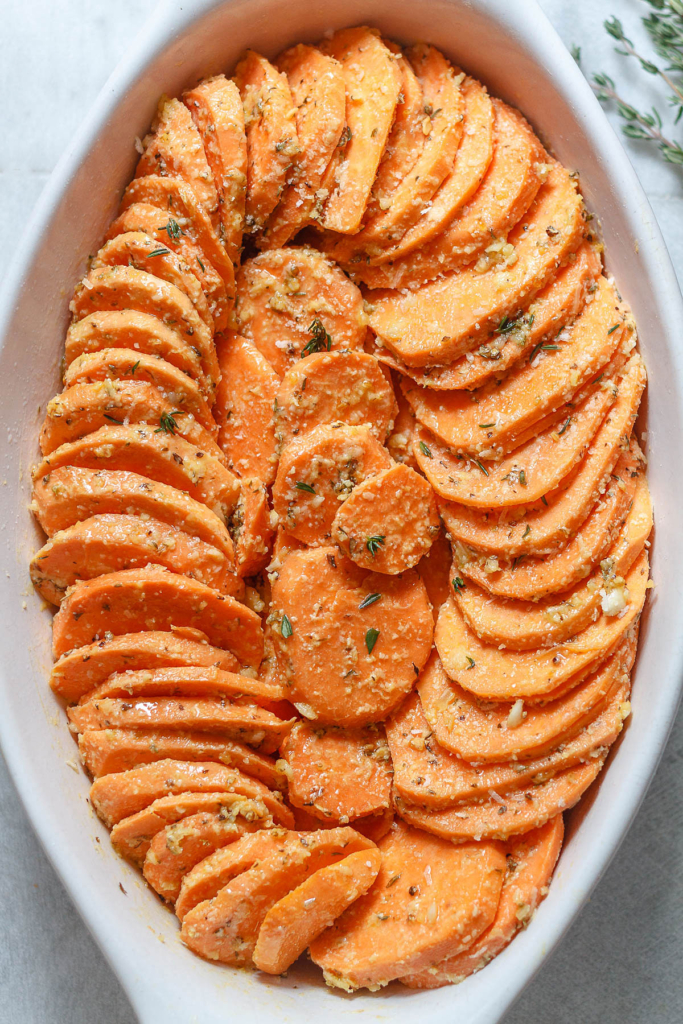 Peel and cut sweet potatoes into thin slices. In the meantime, preheat your oven to 400ºF (200ºC). Place the sweet potato slices in a resealable bag. Throw in the garlic, oil, butter, salt, pepper, Parmesan cheese, and Italian seasoning and shake until well coated. Lightly butter a baking dish and arrange coated sweet potatoes into a spiral. Sprinkle with fresh thyme and a little parmesan if you like. Roast the sweet potatoes for 30-35 minutes. Serve your garlic parmesan roasted sweet potatoes warm and sprinkle with fresh thyme. Enjoy!