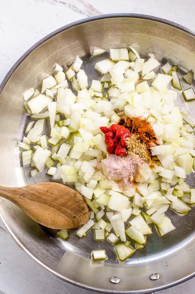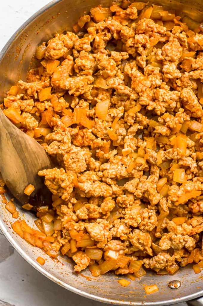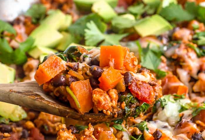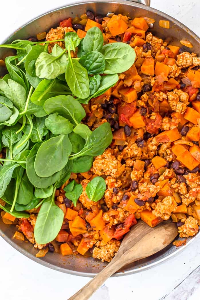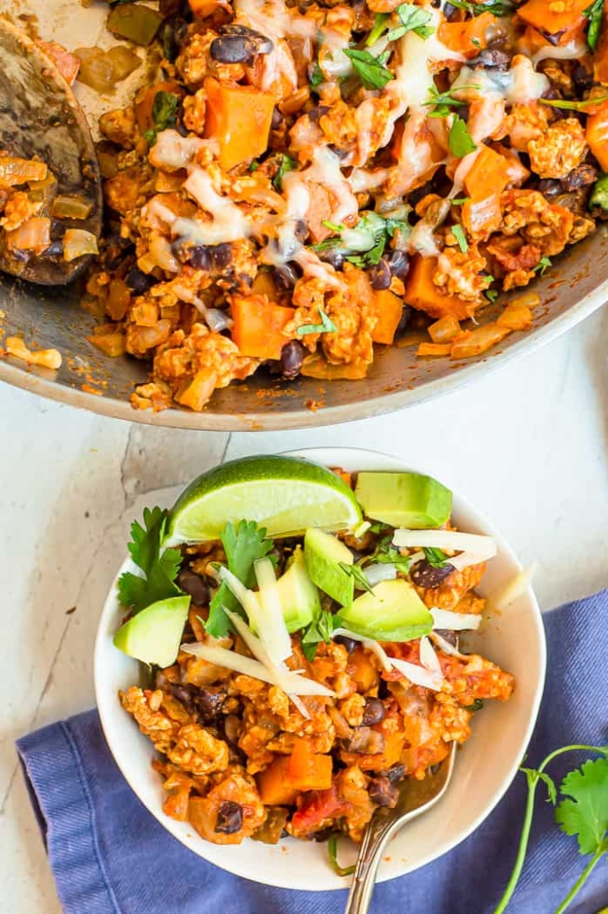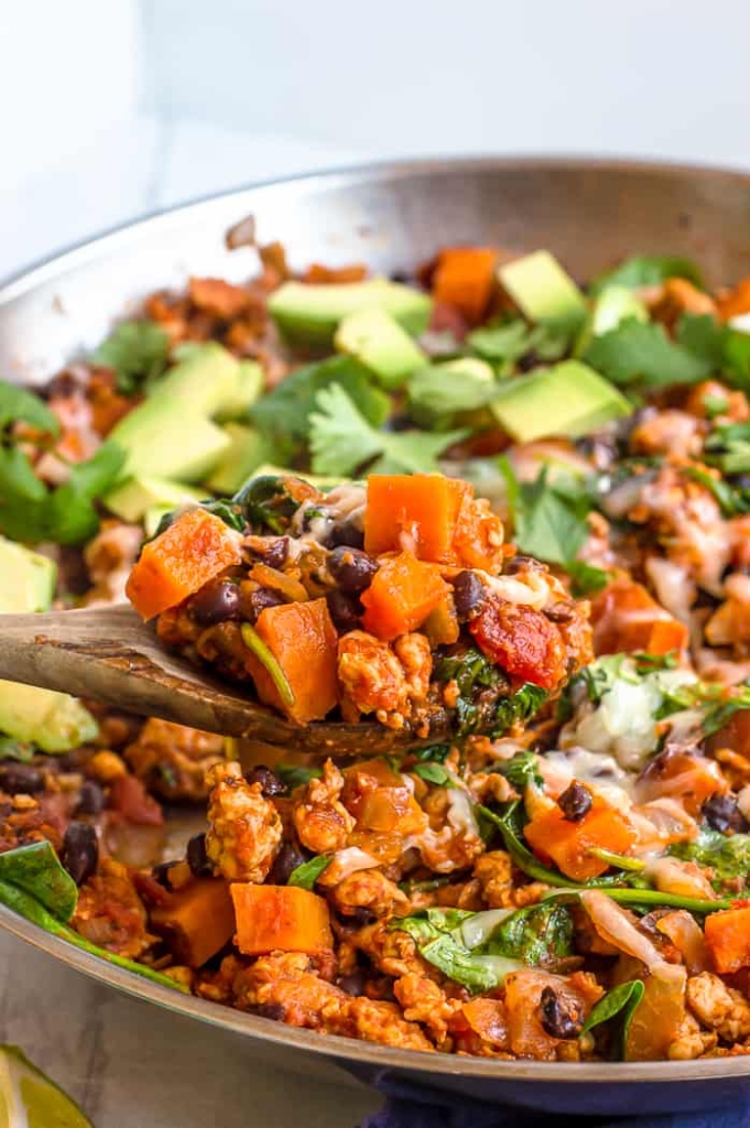 In a large skillet, heat the olive oil over medium-high heat. Once oil is hot, add onions, salt, chili powder, garlic powder, cumin, oregano and tomato paste. Cook until the onions start to turn translucent or approximately 2 minutes. Add the ground turkey. Use a wooden spoon to break up the turkey as it cooks. Cook for about 5-7 minutes or until the turkey is mostly browned. Add sweet potatoes, black beans and salsa to the skillet. Stir to combine. Cover the skillet and cook until the sweet potatoes are tender, stirring occasionally, about 12-14 minutes. Once the sweet potatoes are tender, add in spinach and mix until wilted. Taste and adjust seasoning if needed. Then sprinkle the cheese over the top (if using), and cover skillet until cheese is melted, about 3 minutes. Serve hot topped with more cheese, diced avocado, fresh cilantro, a little lime juice, sour cream, or as is.