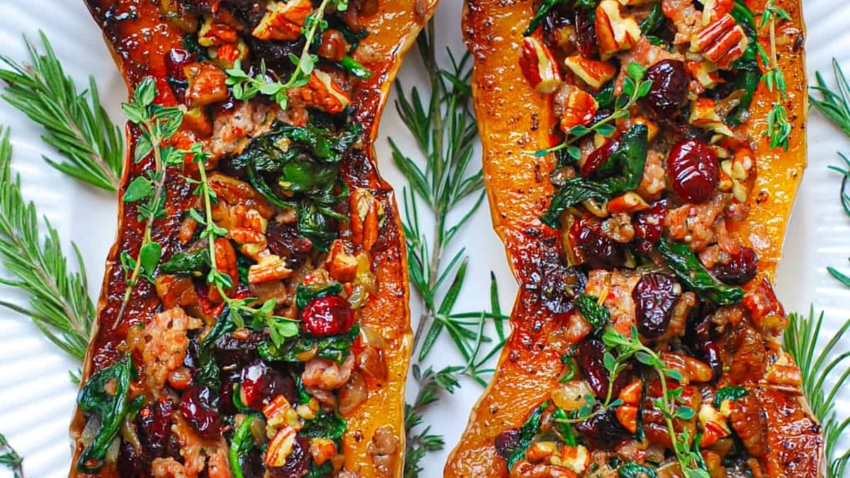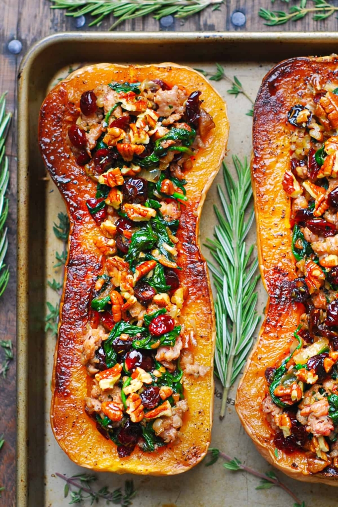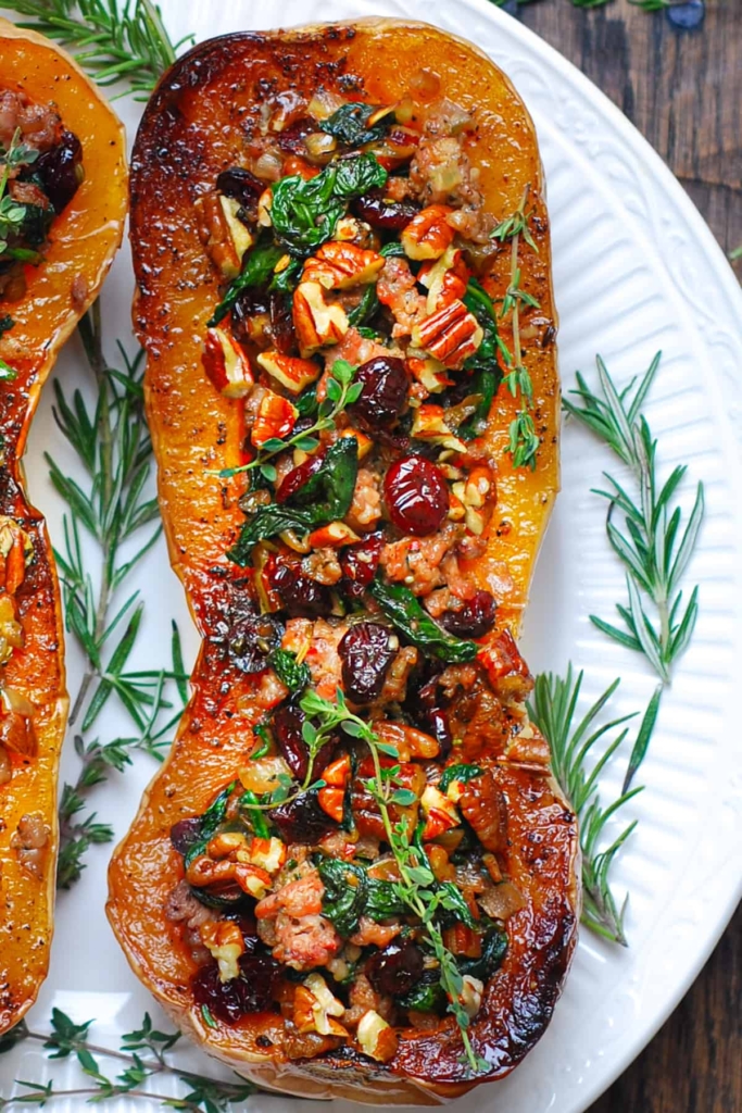 Sausage Stuffed Butternut Squash with Spinach, Pecans, & Cranberries
