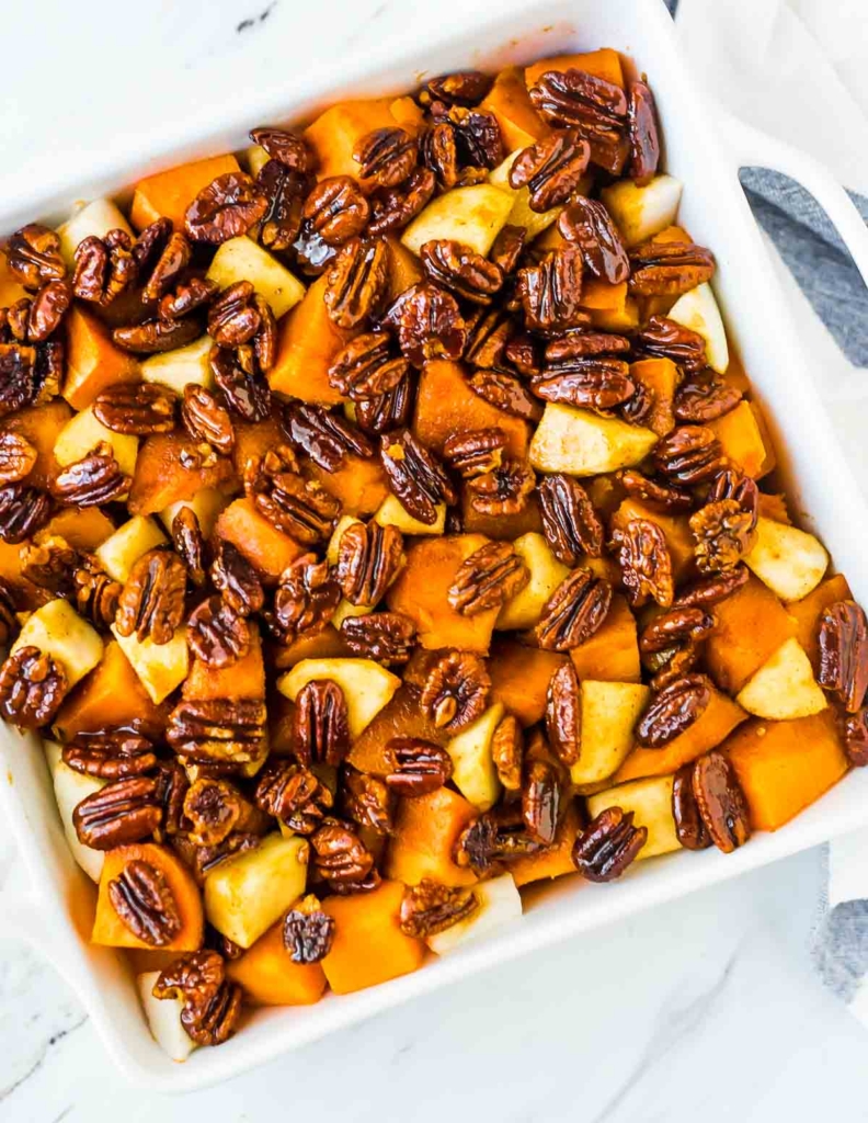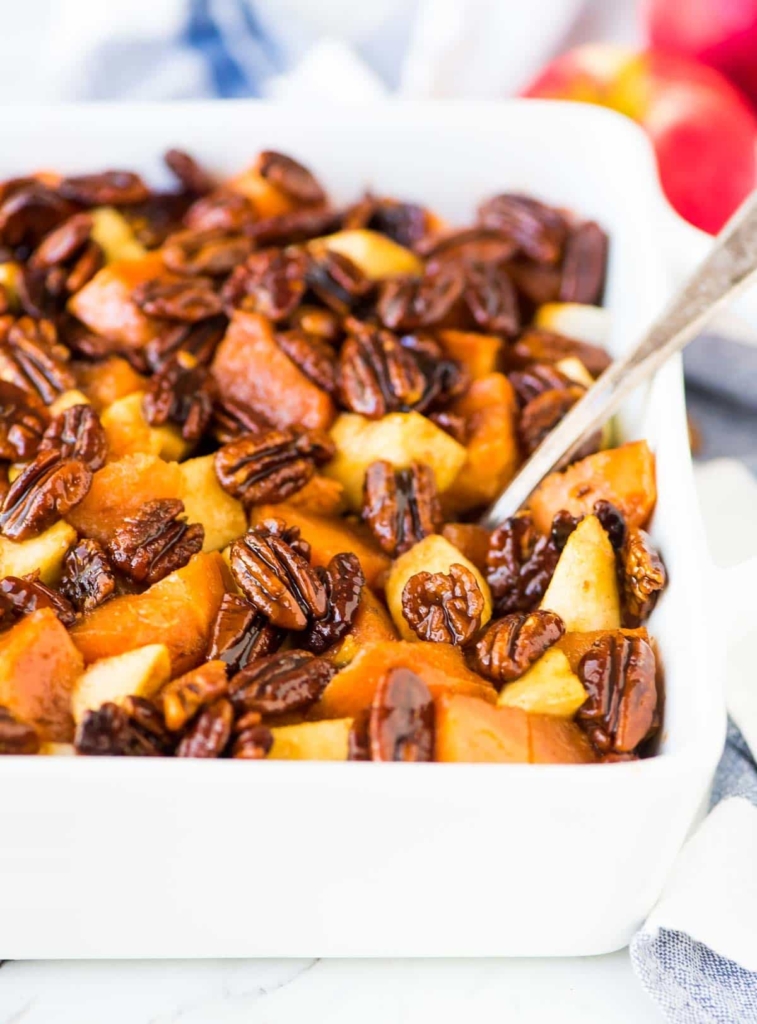 Lightly grease an 9×9-inch baking dish or similar 2-quart casserole dish with cooking spray. Scatter the sweet potatoes and apples in the baking dish, alternating between the two so you have a mix throughout. Pour the whiskey-pecan glaze over the top. Bake at 375 degrees for 20-30 minutes, until the apples are softened (they do not need to be completely mushy, just fork tender) and the dish is fully warmed throughout.
