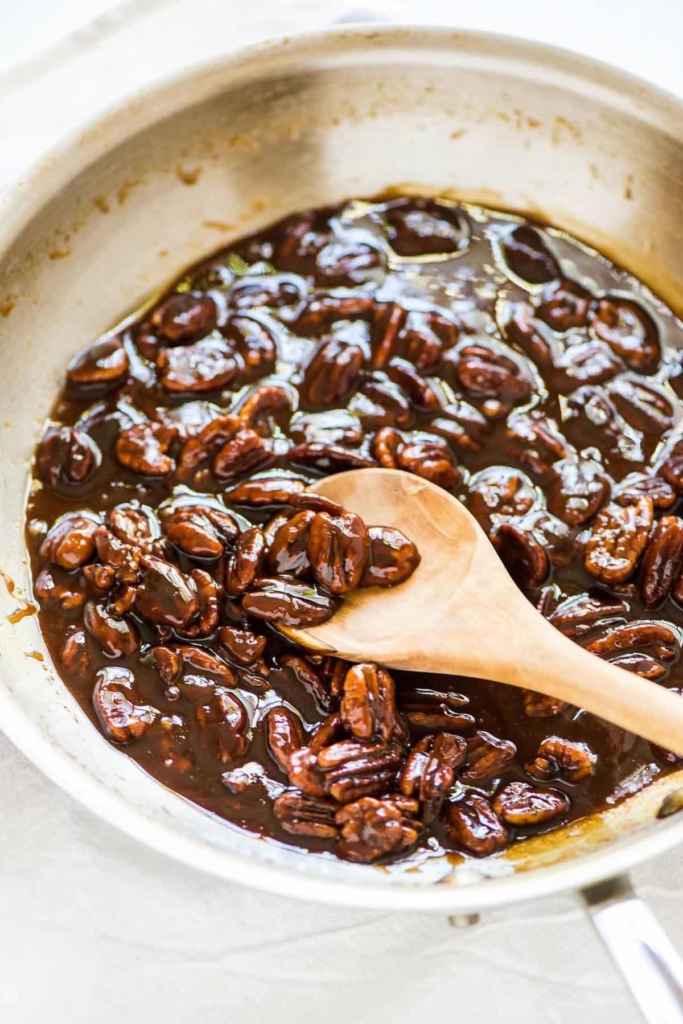 Meanwhile, in a medium skillet over medium heat, add the pecans and lightly toast until fragrant, about 3-4 minutes (watch them carefully so that they do not burn). Add butter and coconut oil, let melt, then add the honey, cinnamon, nutmeg, salt, and cayenne. Allow the mixture to simmer and bubble for 4 to 5 minutes. Carefully add the whiskey—stand back a bit from the pan, as the honey mixture will begin to bubble violently. Let simmer for 5 additional minutes, until slightly reduced. The glaze will still seem a bit liquidy
